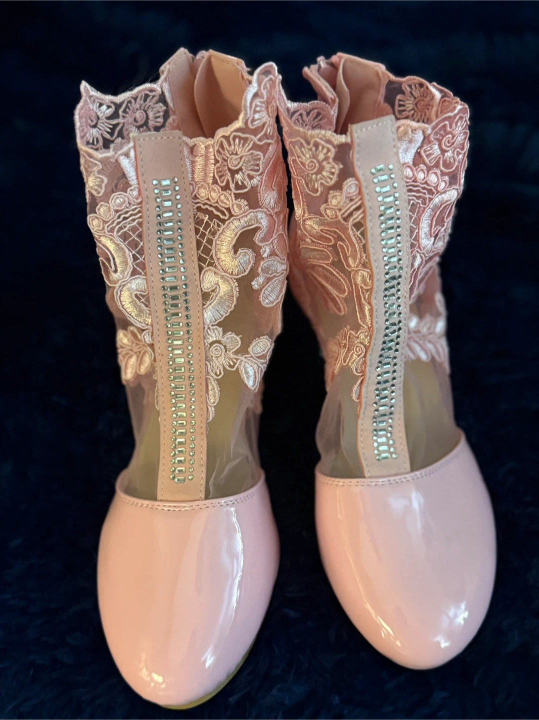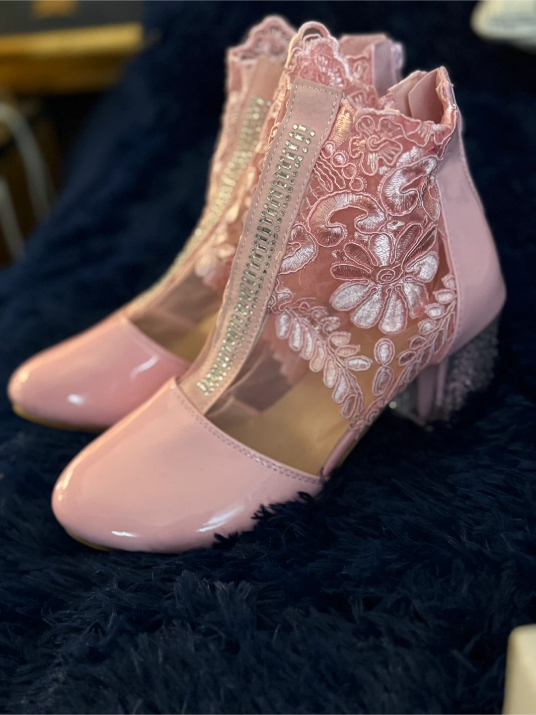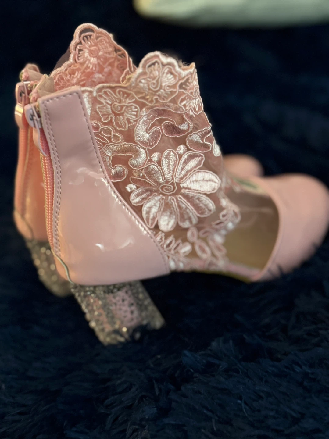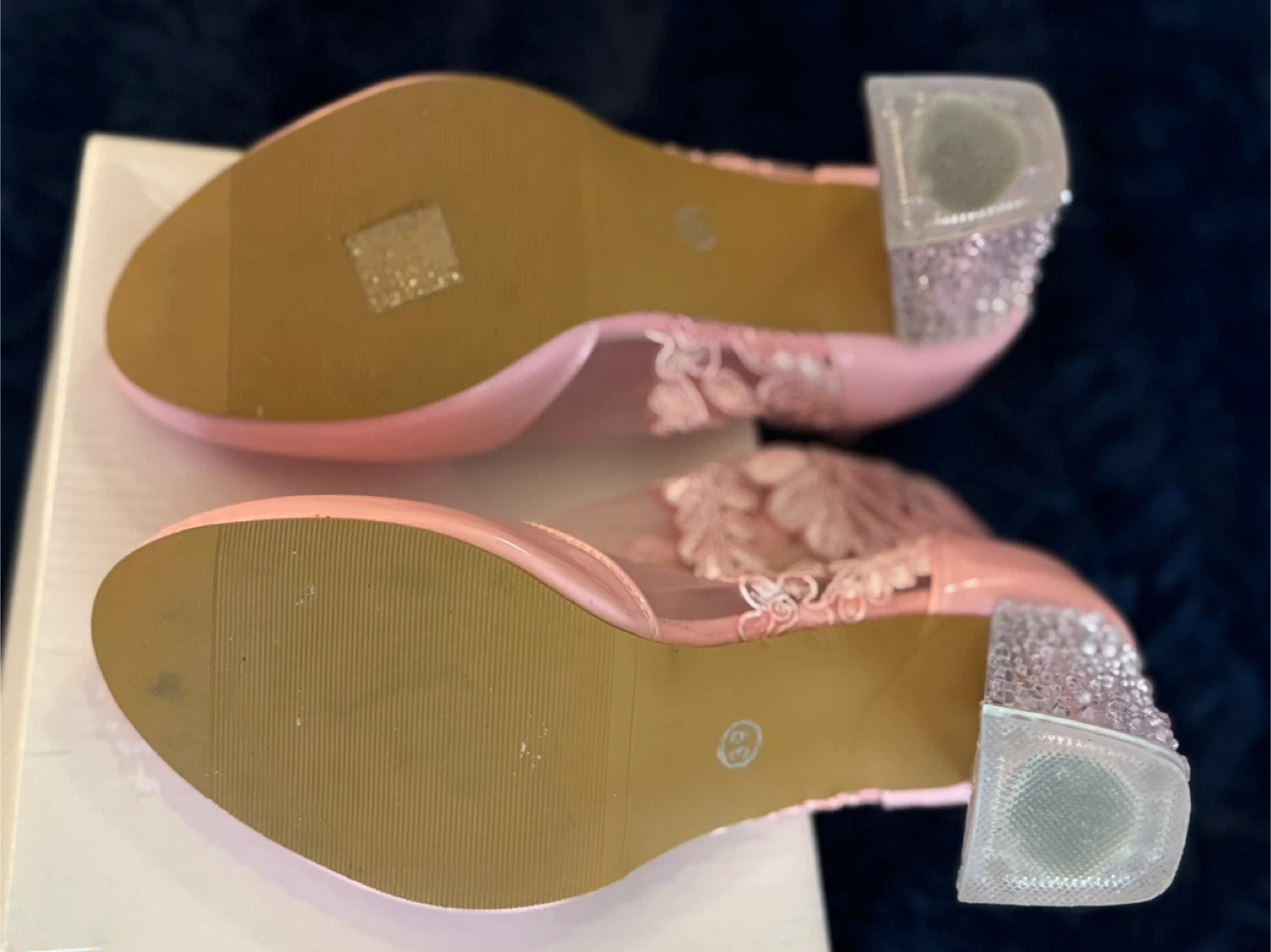 248These adorable pink heels feature a unique lace design and a sparkly heel! They're in great condition and ready for a new home. Size 39