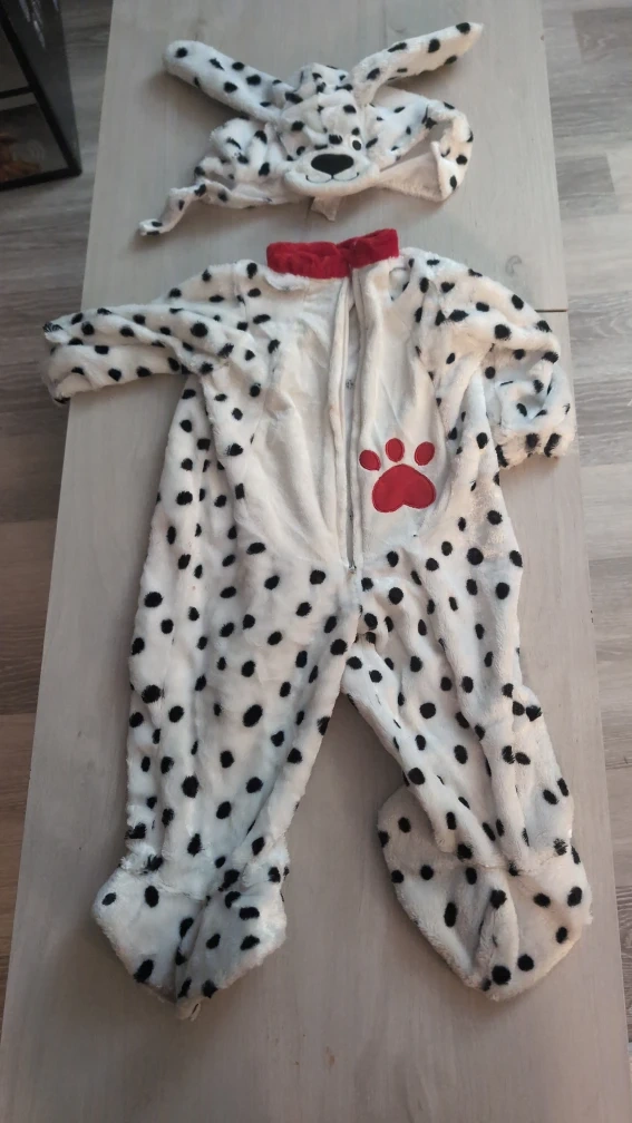 Super cute Dalmatian costume for toddlers! This adorable outfit includes a hooded headpiece and a full-body suit with footies. Perfect for dress-up or Halloween, sized for 18-24 months.