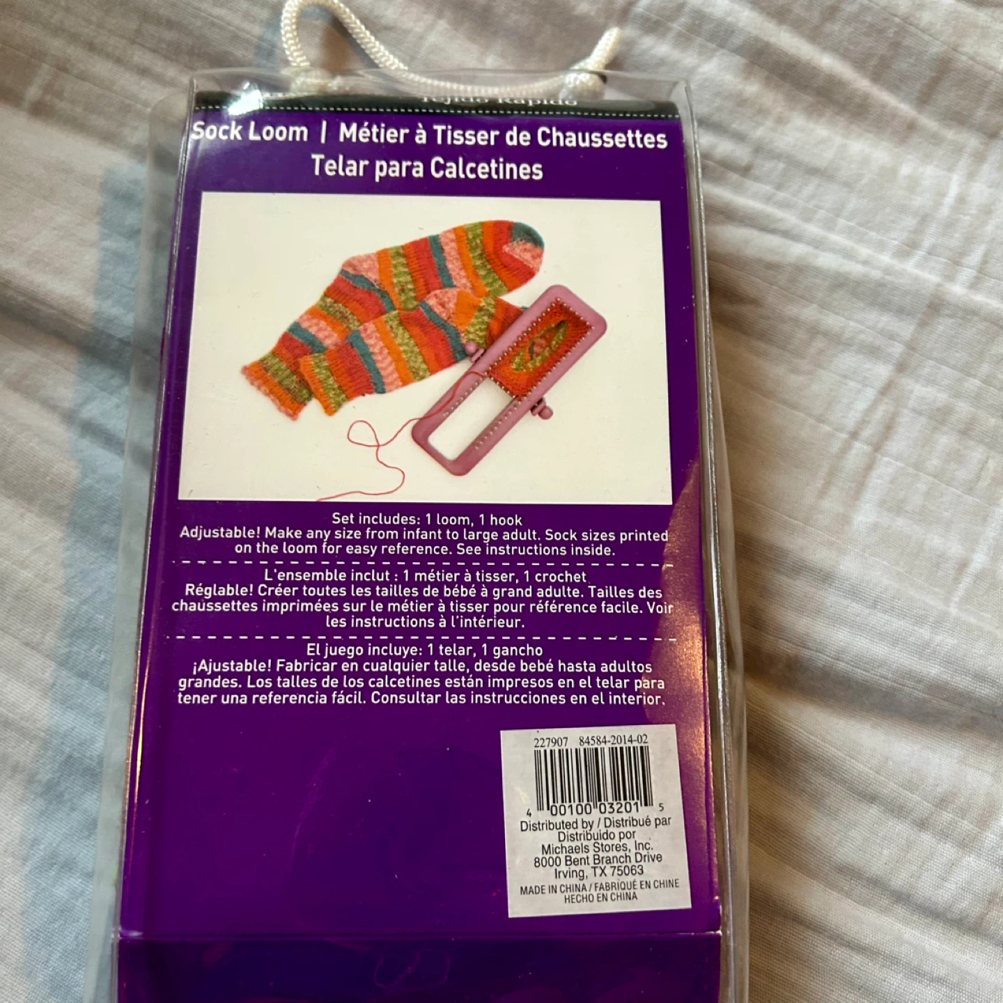 Selling a brand new Loops & Threads Knit Quick Sock Loom! It's adjustable to make any size from infant to large adult. Set includes one loom and one hook. The package is 3 in x 9.3 in (7.6 cm x 23.6 cm)