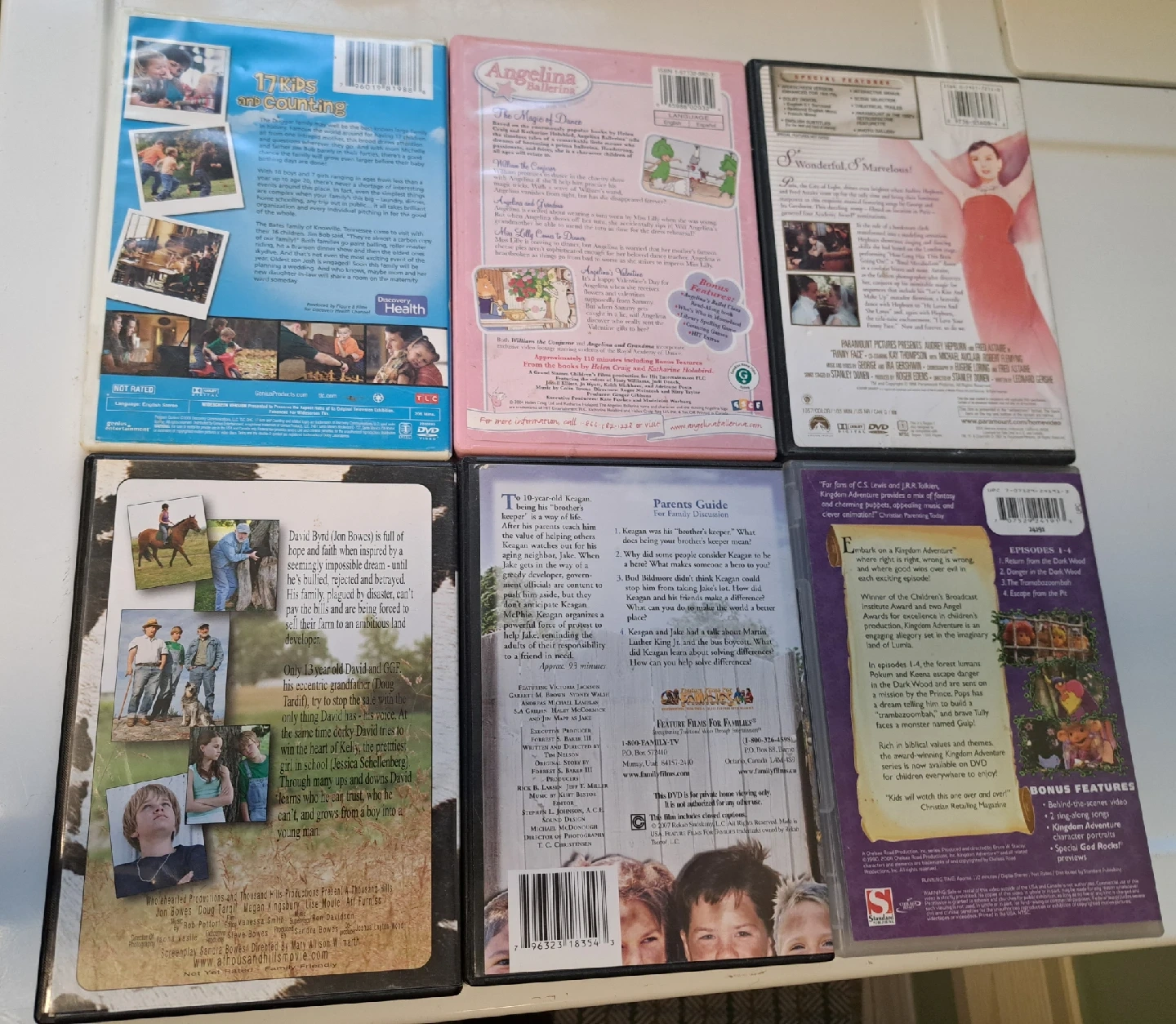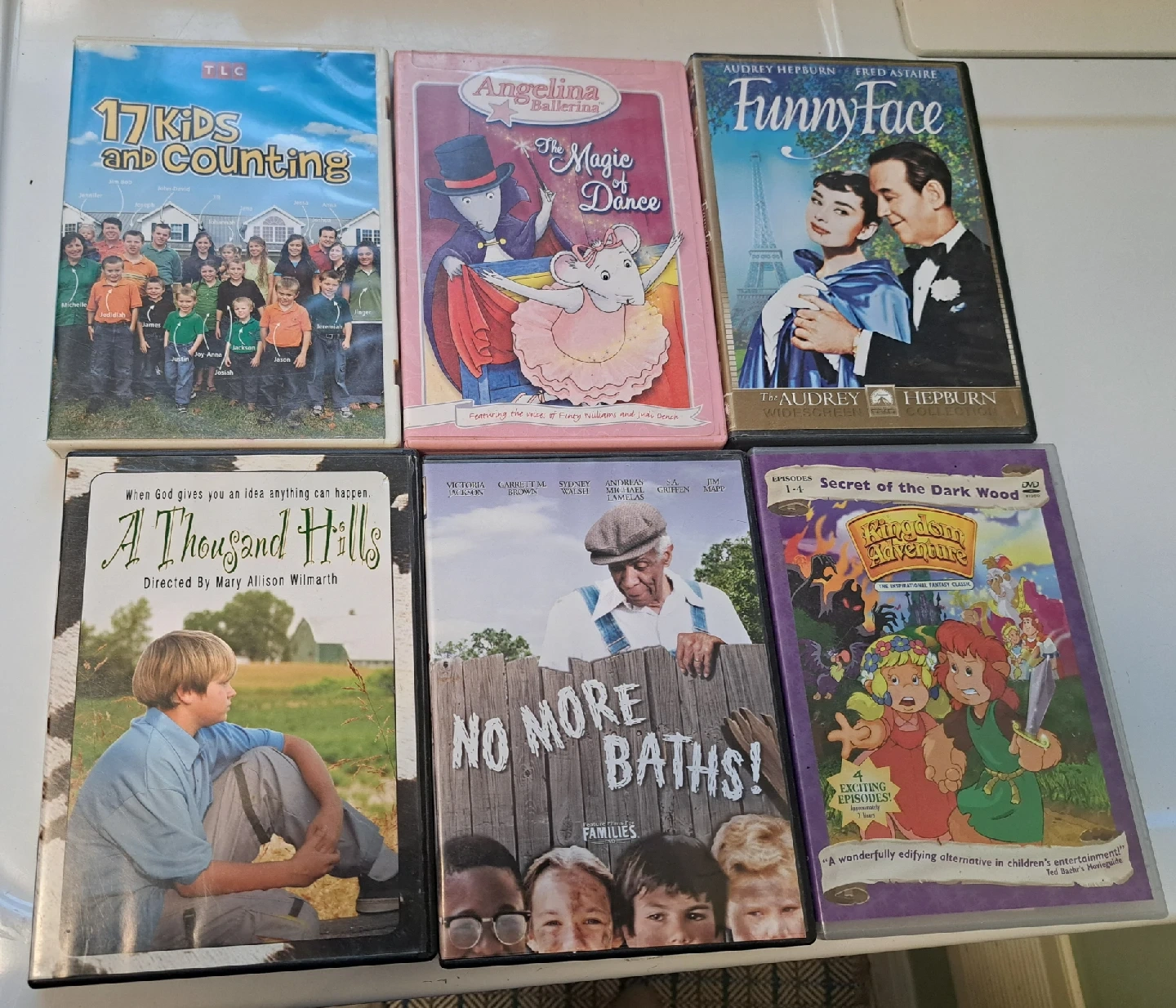 Selling a collection of DVDs, perfect for family viewing! Includes titles like '17 Kids and Counting', 'Angelina Ballerina: The Magic of Dance', and the classic 'Funny Face'. Also includes 'A Thousand Hills', 'No More Baths!', and 'Secret of the Dark Wood'. Great for kids and adults alike. Sold as a set.