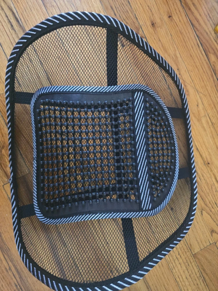 This is a mesh lumbar support designed to provide back support for chairs or car seats. It is made of mesh material to promote airflow and keep you cool. It also features a beaded area for extra support and comfort. Great for office chairs, car seats, or any chair where you need a little extra lumbar support