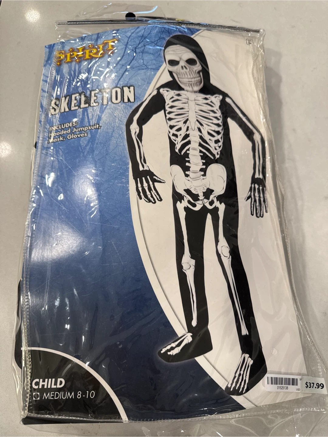 Get ready for Halloween with this Spirit Halloween skeleton costume! It's a child's size medium, fitting sizes 8-10. The costume includes a hooded jumpsuit, mask, and gloves. Originally bought for $37.99!