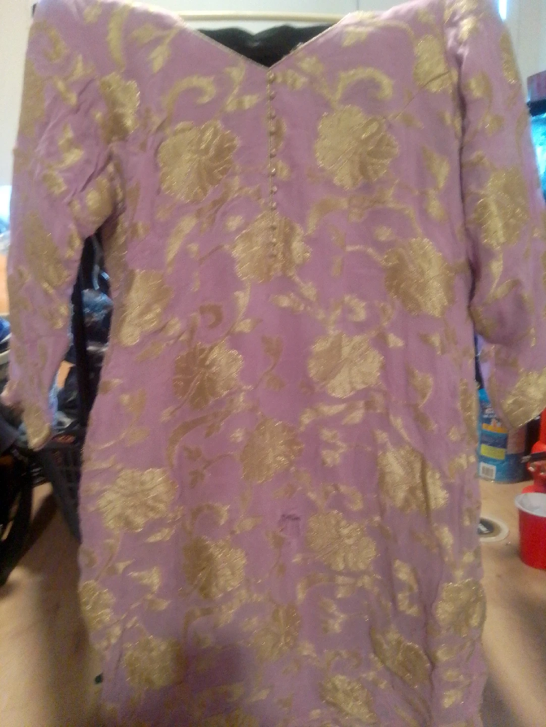 Here's a lovely floral print top in a lilac and gold colour combination. It has a V-neck and 3/4 sleeves. It's in good condition and ready for a new home!