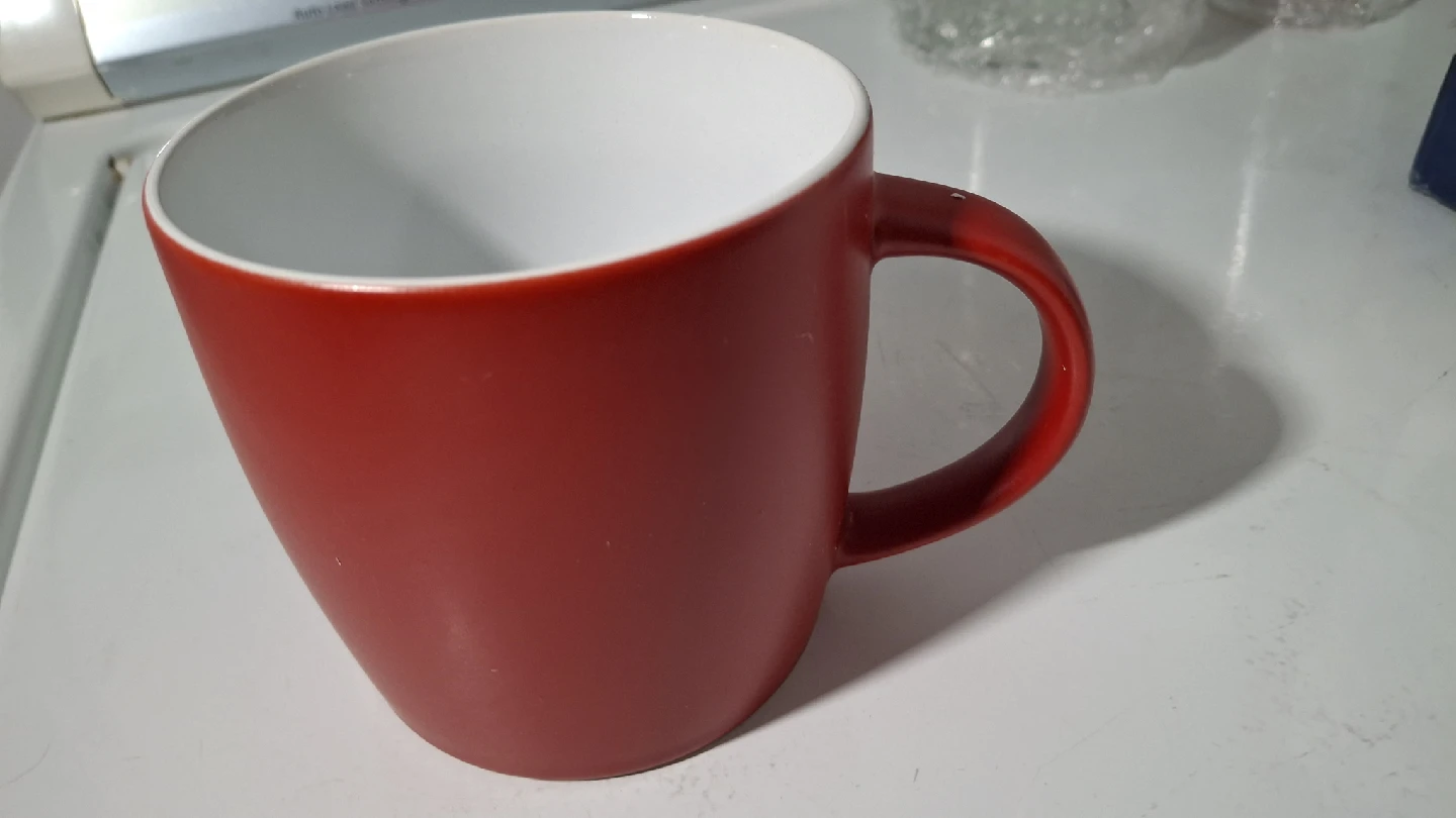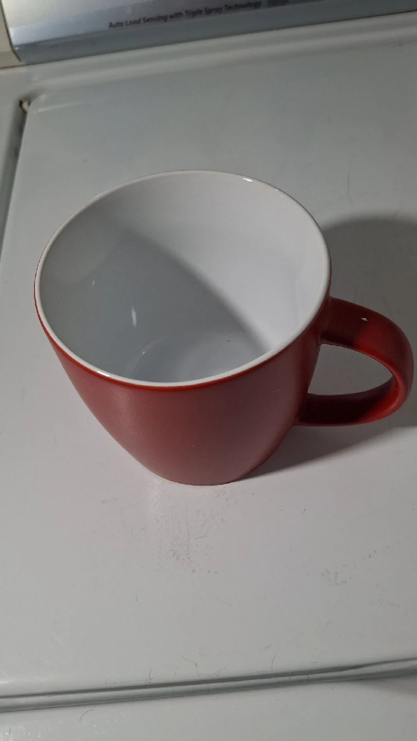 A simple red and white ceramic mug, perfect for your morning coffee or tea! It's in great condition and ready for a new home
