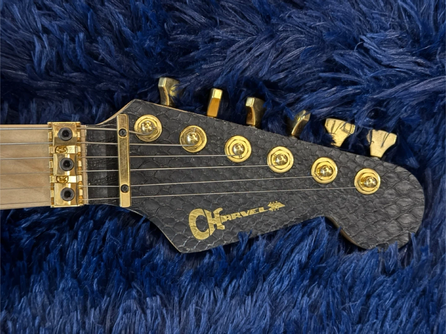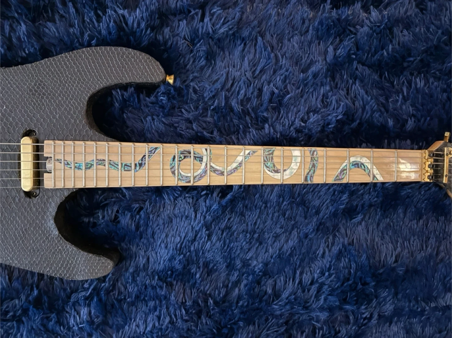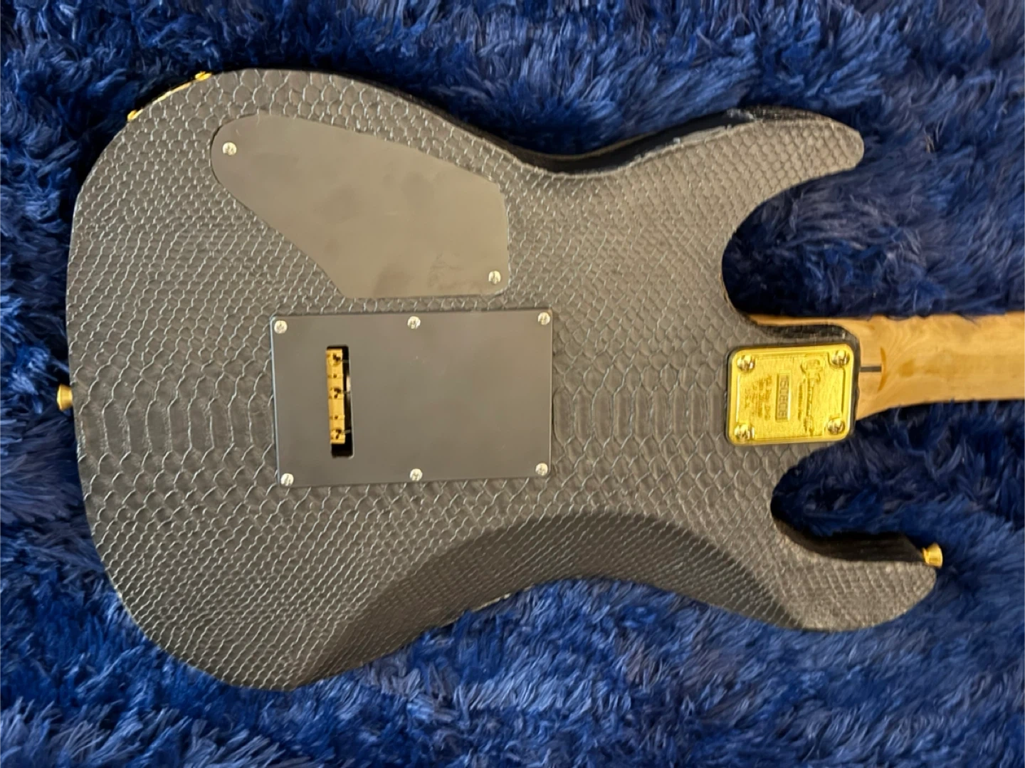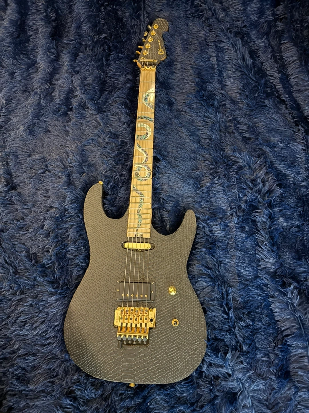 248Selling a Warren DeMartini tribute Charvel electric guitar. It has a unique snakeskin-like finish and gold hardware. The fretboard has a snake inlay. Great for any guitar enthusiast!