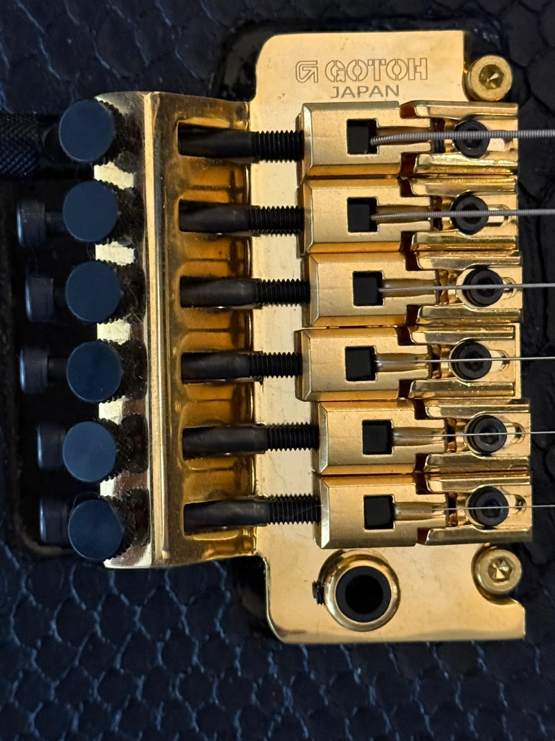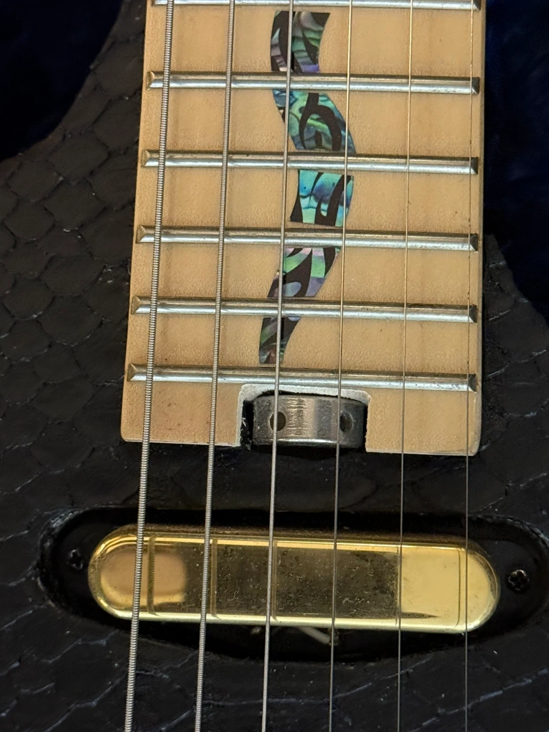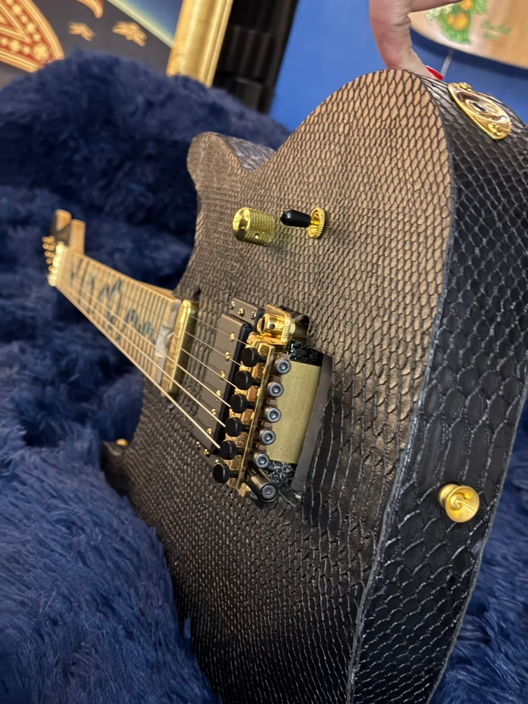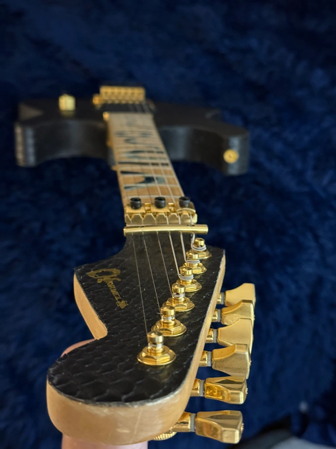 248Selling a Warren DeMartini tribute Charvel electric guitar. It has a unique snakeskin-like finish and gold hardware. The fretboard has a snake inlay. Great for any guitar enthusiast!