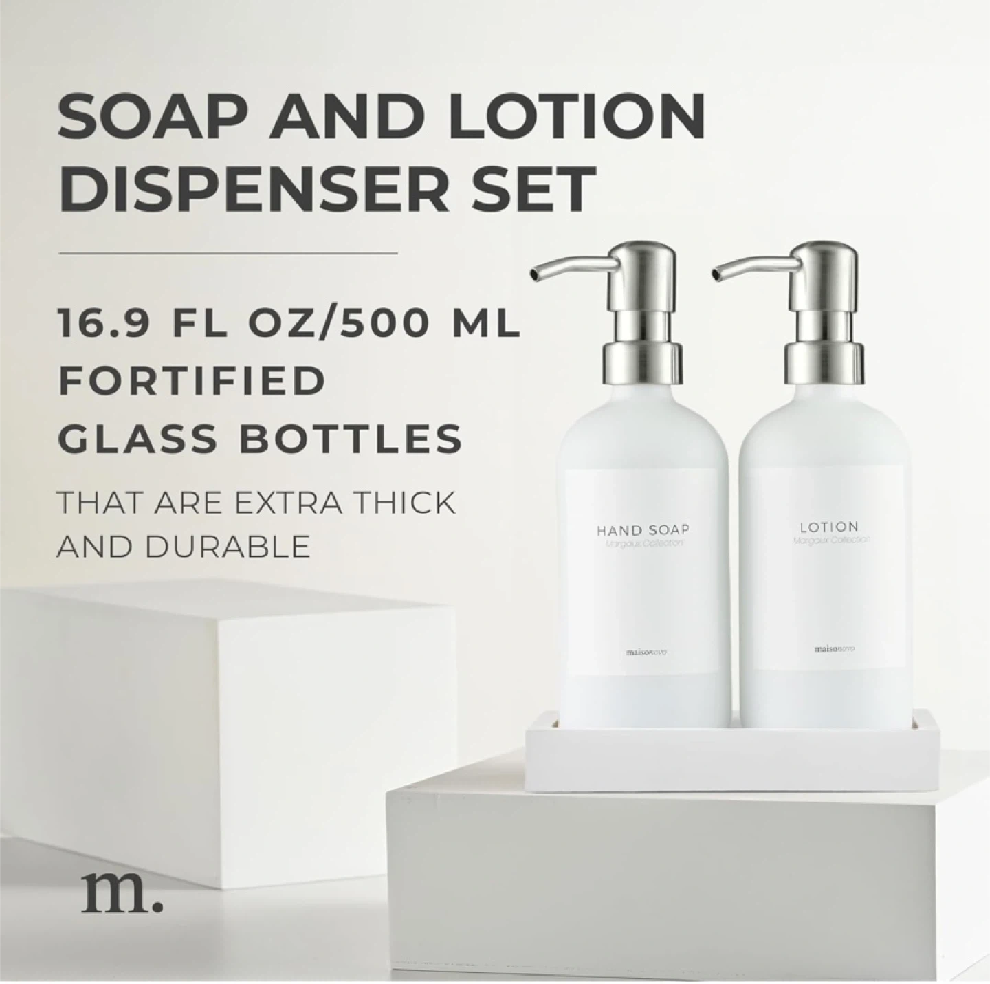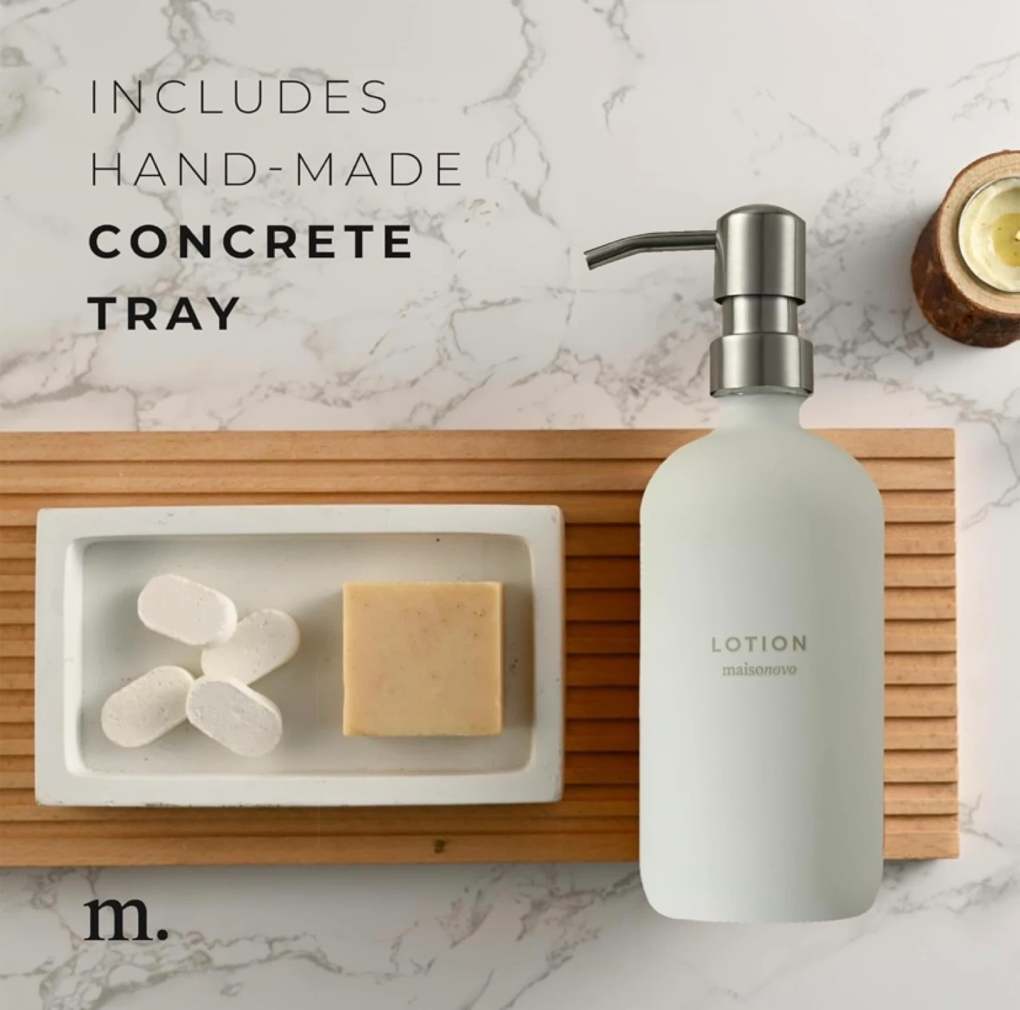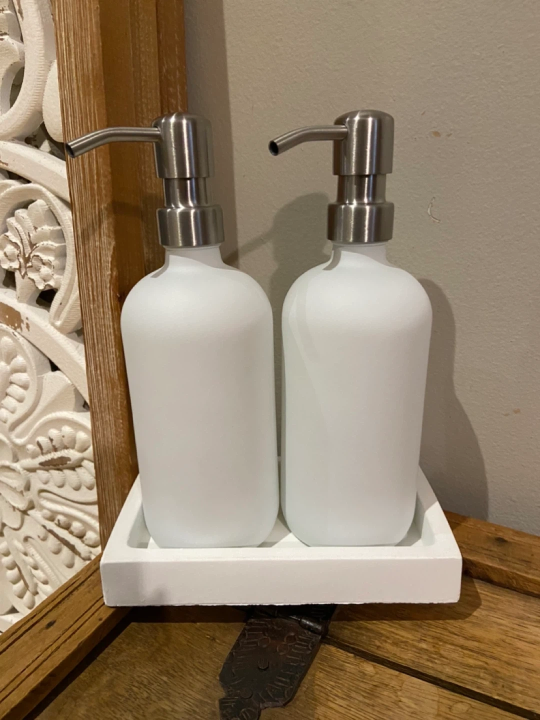 294New Soap Dispenser 3-Piece Set 16.9oz White Glass bottles, Concrete Tray Labels not included $15 (retail $40 plus tax) Pickup in Whitby