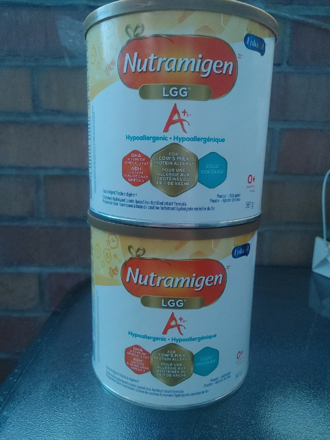 Selling 2 cans of Nutramigen LGG A+ hypoallergenic infant formula for babies 0+ months. This formula is designed for cow's milk protein allergy and colic. It contains DHA, ARA, and a type of Omega-3 fat. The can contains 561g of powder; just add water!