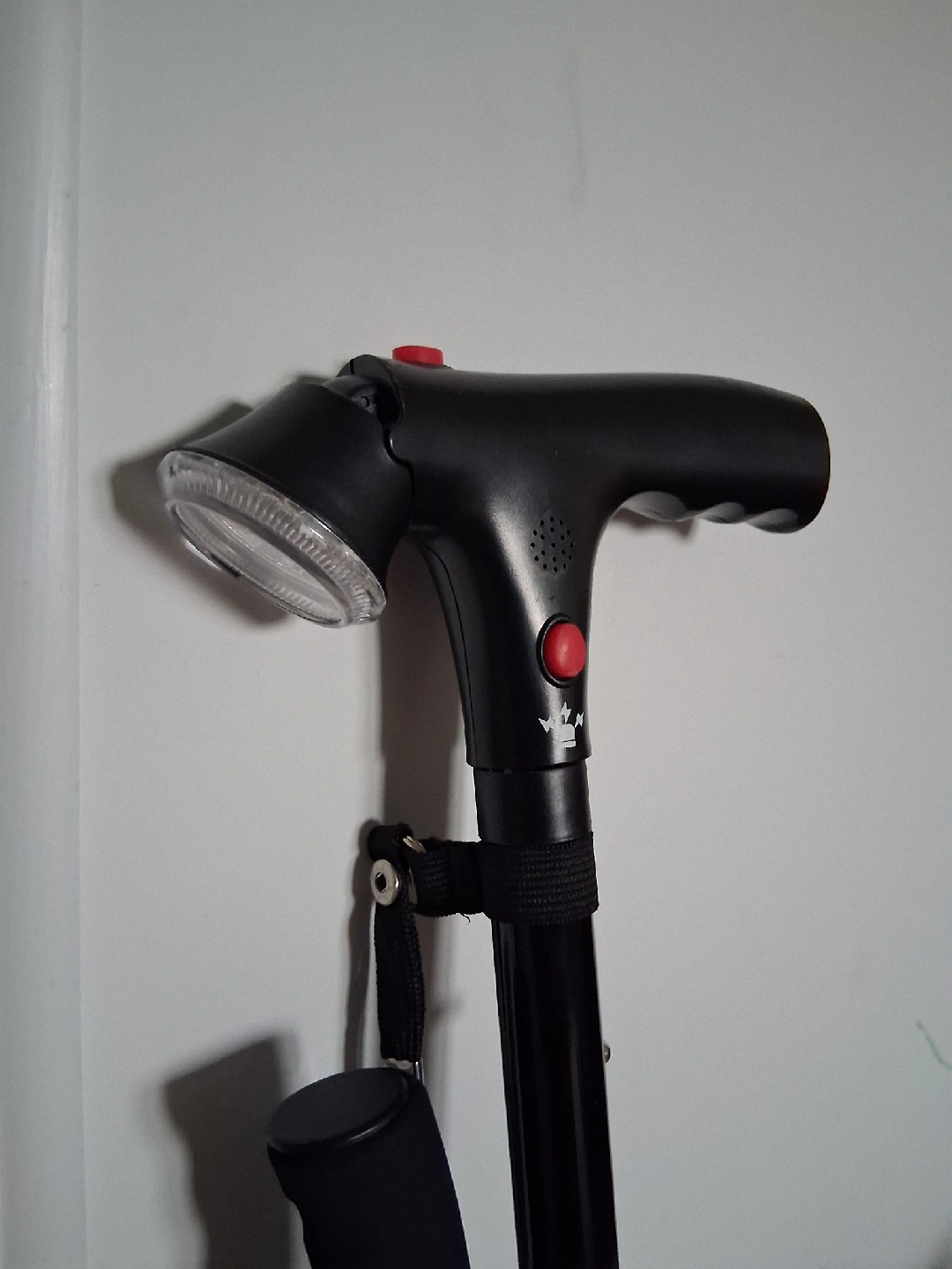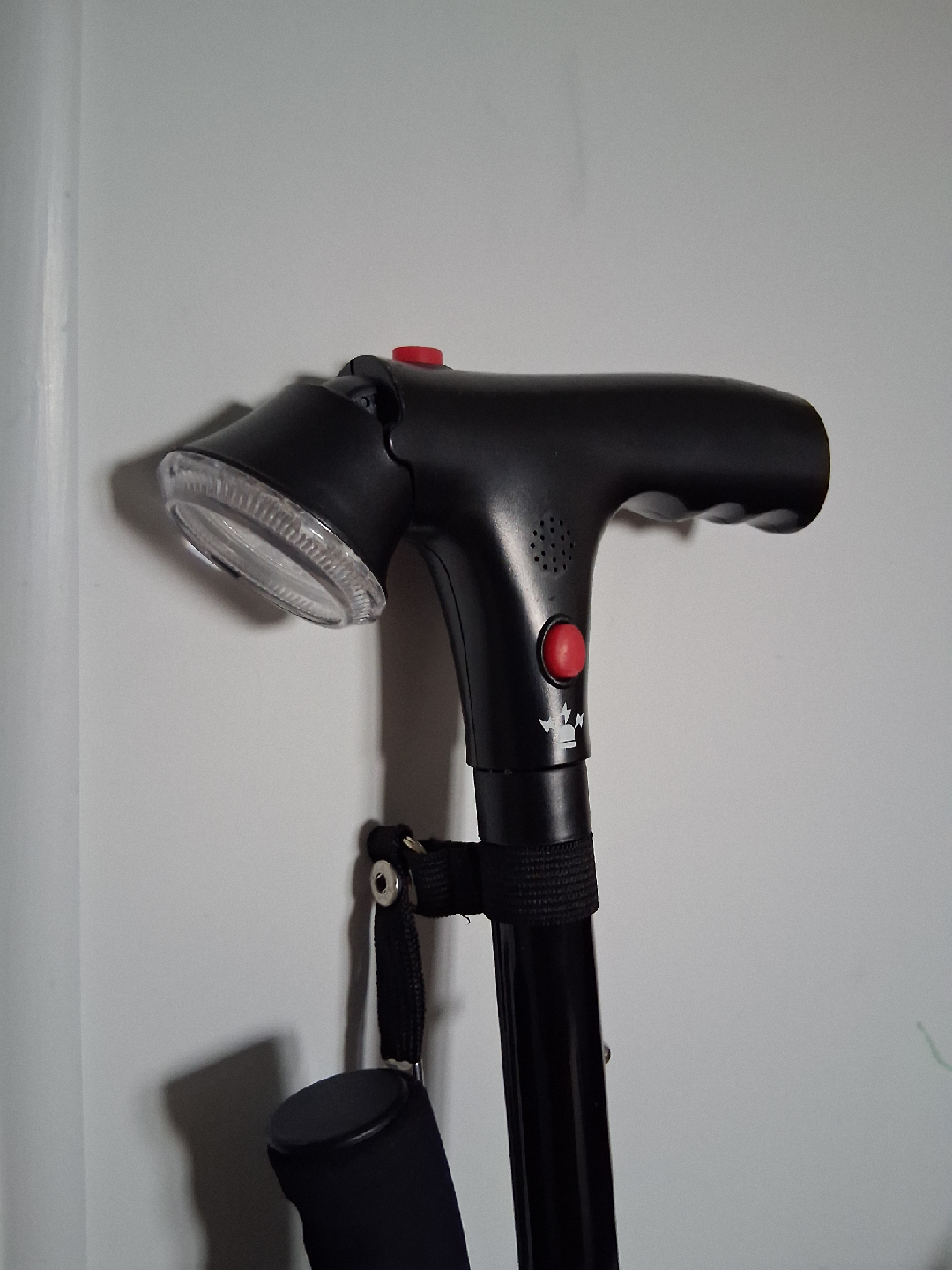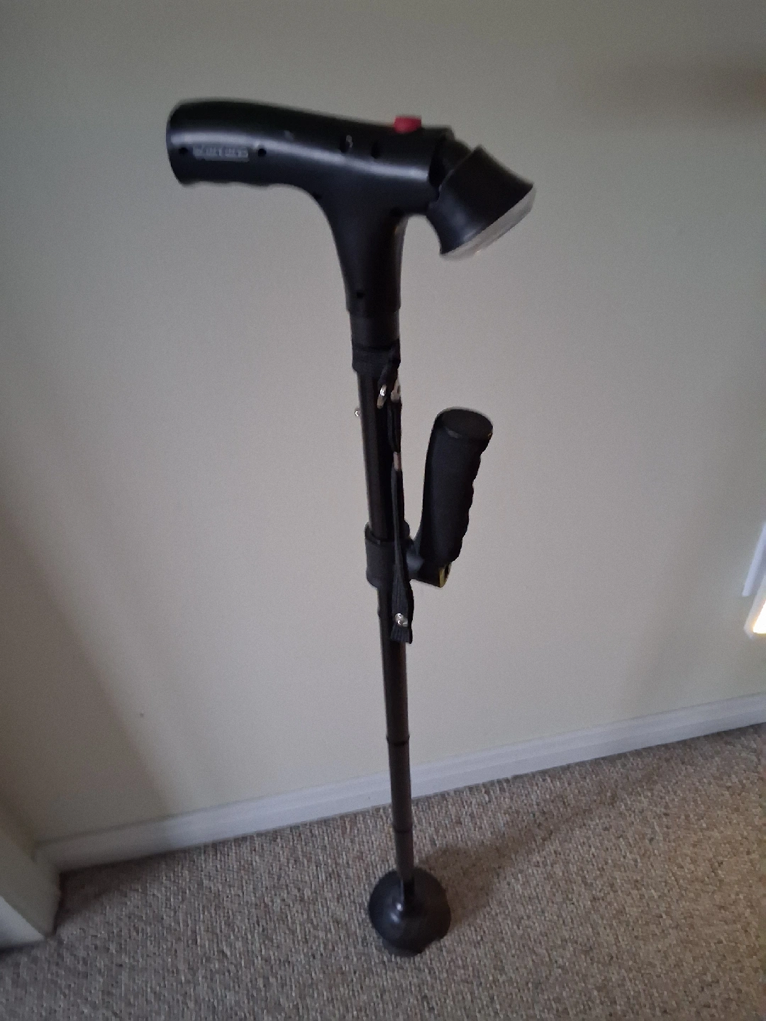 This is an adjustable walking cane with a built-in LED light for added safety and convenience! It's in great condition and ready to assist you on your walks. It also has an alarm button to alert when needing assistance. Takes 2 AAA batteries.