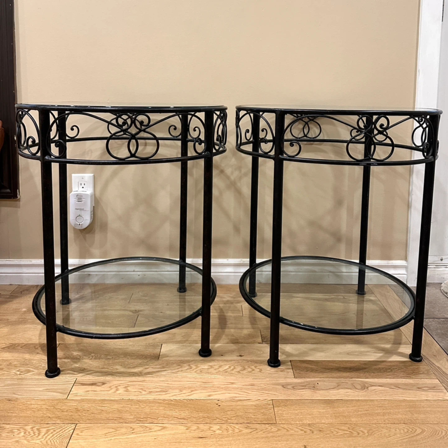 Add timeless charm to your space with this beautiful pair of wrought iron and glass side tables. Each table features a sturdy metal frame with decorative scrollwork and two glass tiers — perfect for displaying lamps, books, or décor.