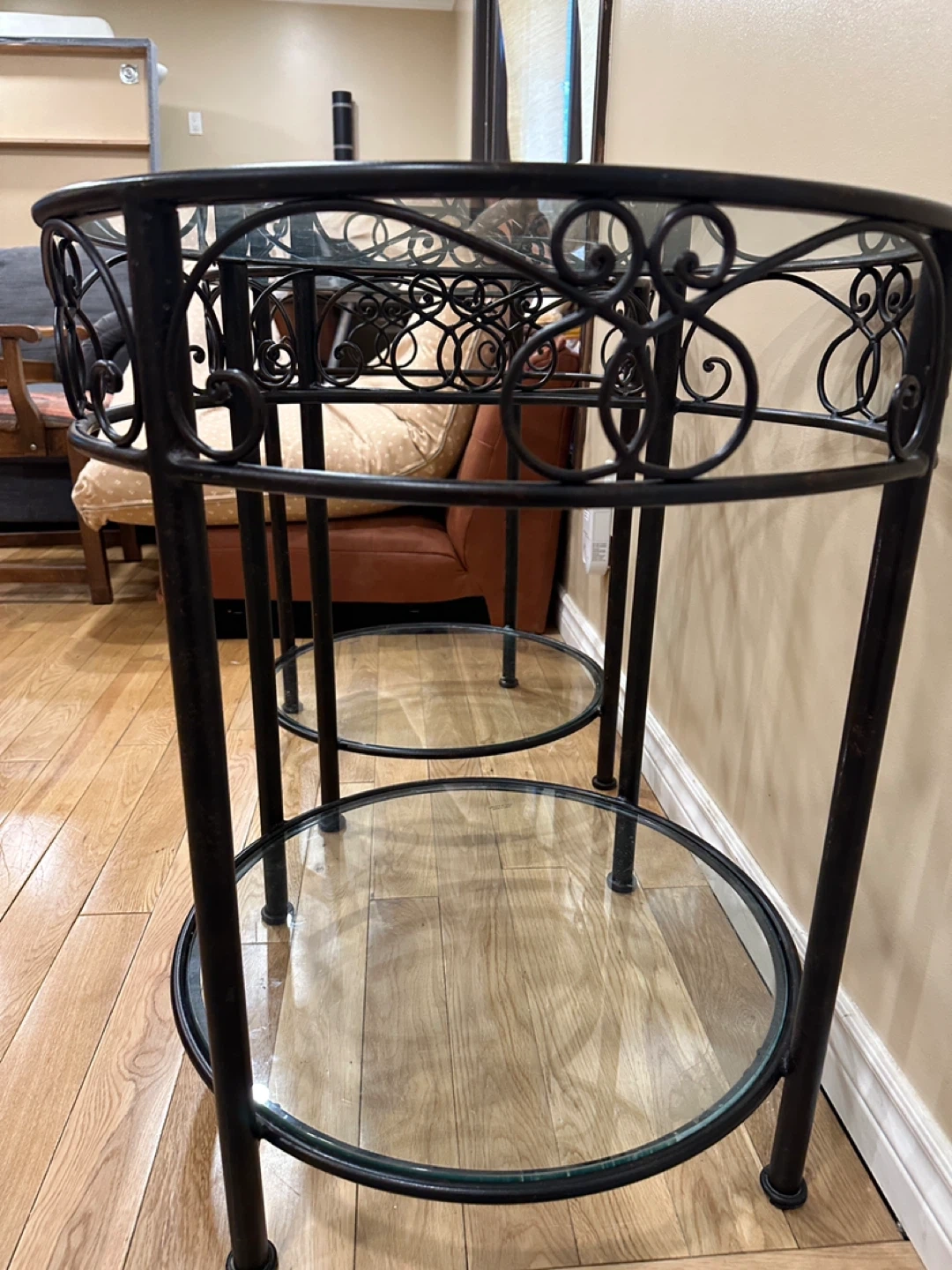 • Material: Black wrought iron frame with clear glass tops and shelves