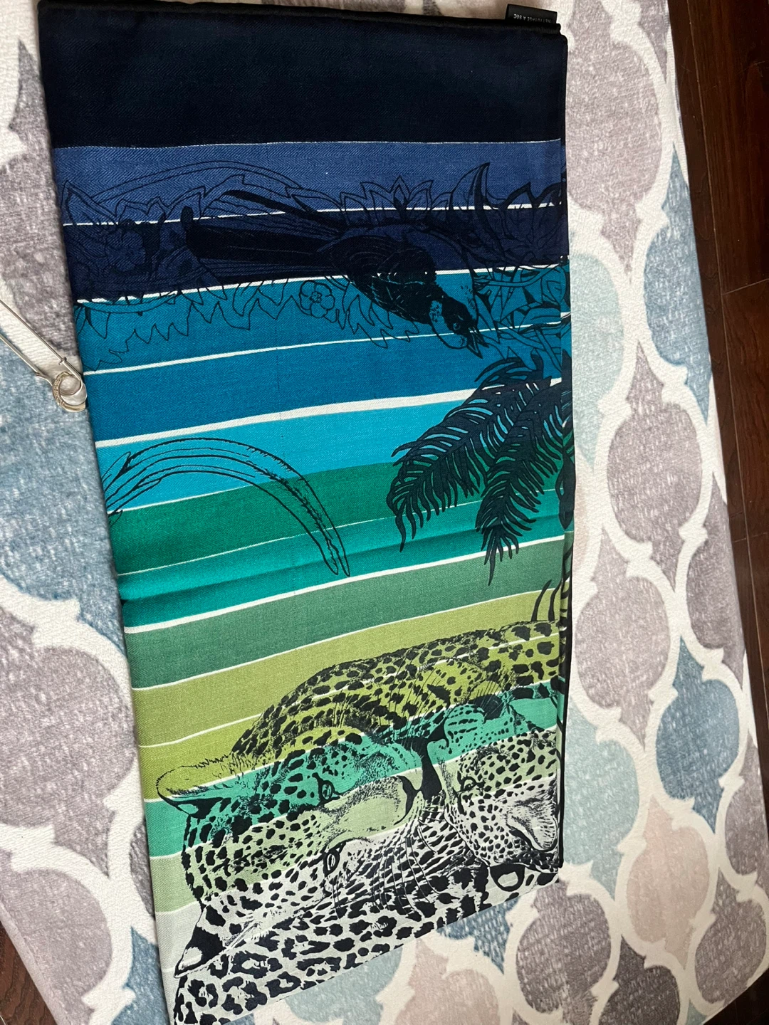 Beautiful designer scarf made of 70% cashmere and 30% silk! It features a unique print with stripes and animal/nature motifs in shades of blue, green, and black. Soft and luxurious, perfect for adding a touch of elegance to any outfit