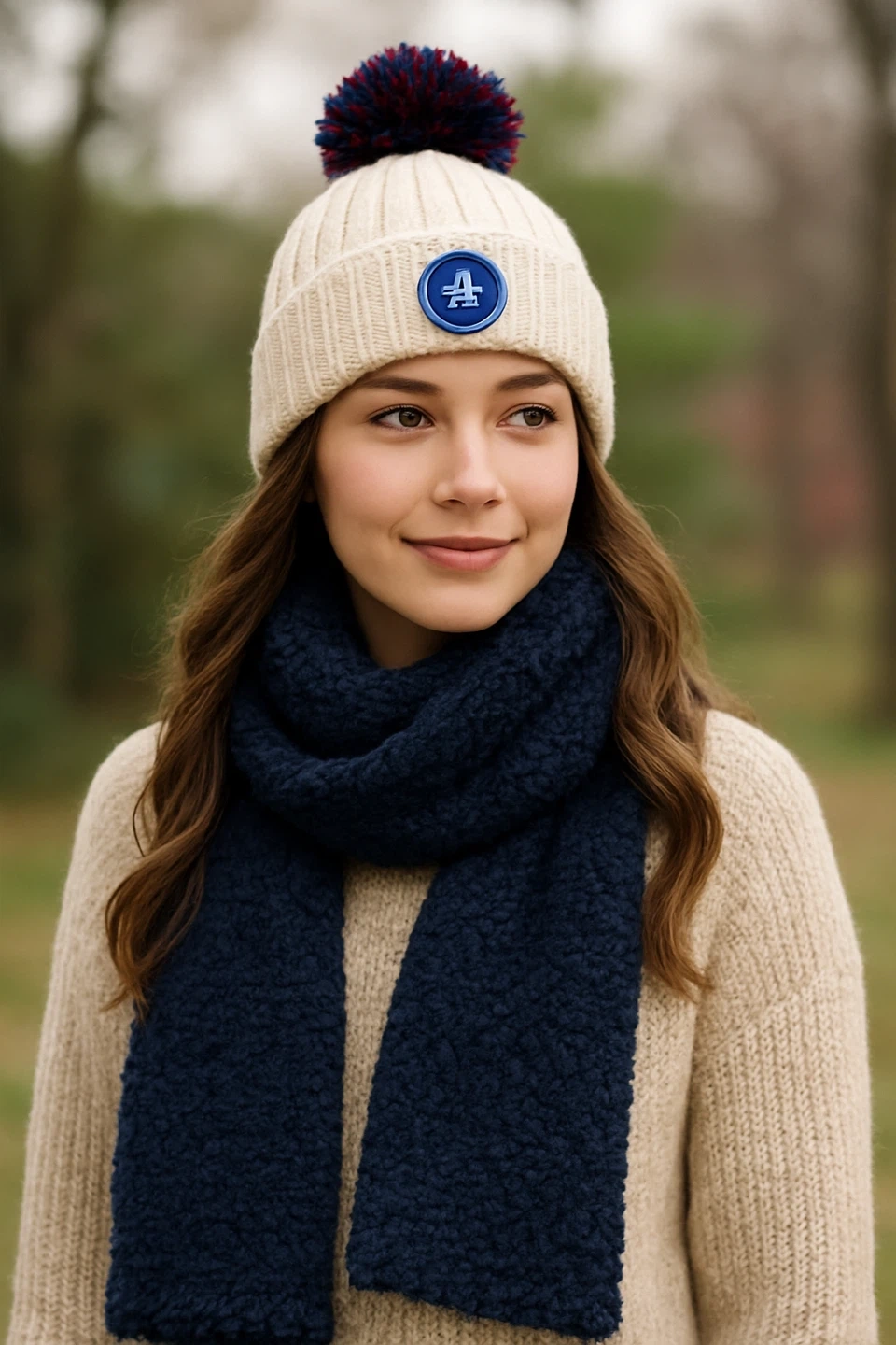Cozy up with this American Eagle beanie and scarf set! The beanie is a cream colour with a cute pompom on top, and the scarf is a soft, navy blue sherpa material. Perfect for staying warm this winter season!