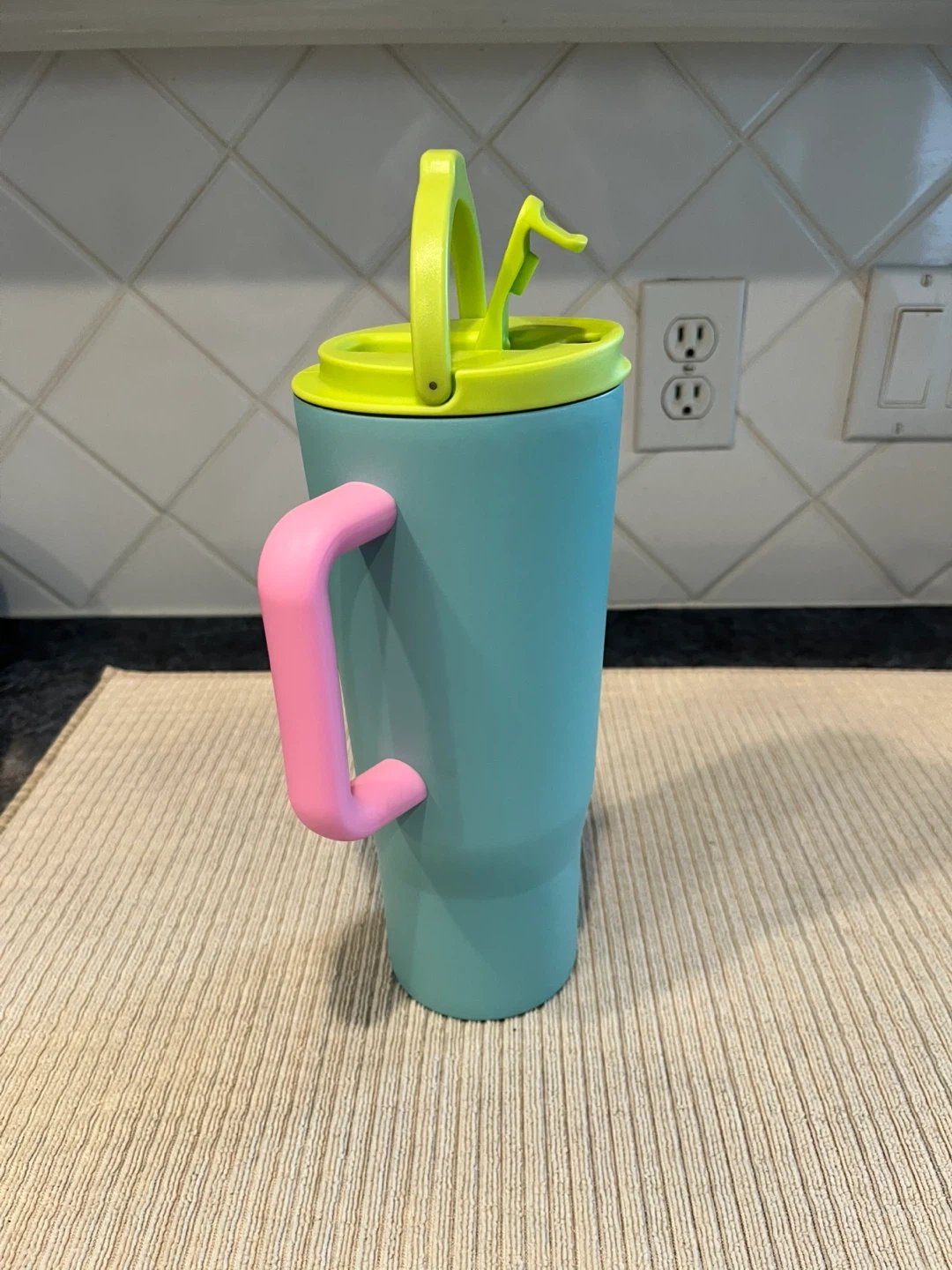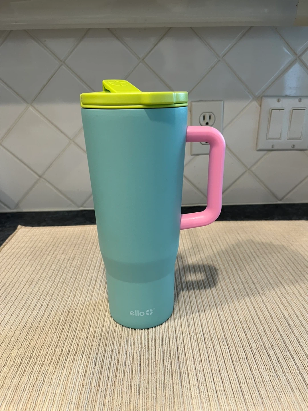 I'm selling an Ello Ella 40oz tumbler, and has a cute teal and pink design. It's dishwasher safe and BPA free, perfect for staying hydrated on the go.