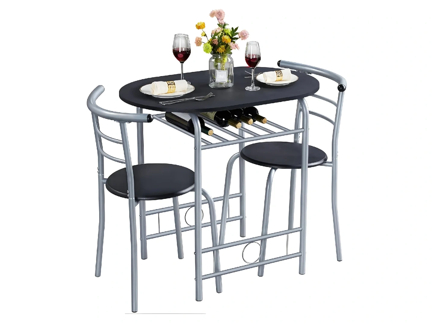 Yaheetech 3-Piece Dining Room Table Set, Kitchen Table & Chair Sets for 2, Compact Table Set w/Steel Legs, Built-in Wine Rack for Breakfast Nook, Small Space, Apartment, Black