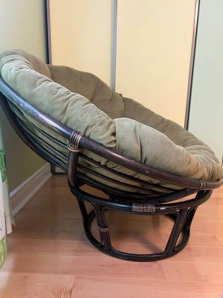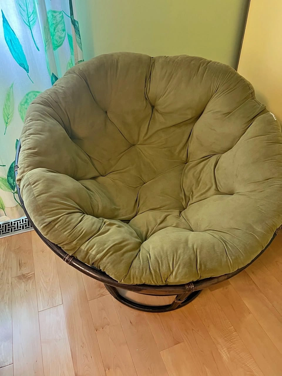 75Add comfort and character to your space with this oversized Papasan Chair, featuring a plush green cushion and a deep, cozy seat. Very similar in style and comfort to the Zowie Upholstered Accent Chair from Wayfair, which retails new for over $300 CAD. Condition: Almost new, gently used Style: Modern boho with a wide, cushioned seat—perfect for reading, lounging, or adding flair to your room Cushion: Soft green cushion included Dimensions: Overall: 35" H × 42" W × 42" D (≈ 89 cm × 107 cm × 107 cm) Seat: 18" H × 41" W × 5" D (≈ 46 cm × 104 cm × 13 cm) Seat Cushion Diameter: 42" (≈ 107 cm) Base Height: 13" (≈ 33 cm) Weight: 29 lb (≈ 13.2 kg) Location: Pickup in Thornhill This is a great deal for a stylish, oversized chair in excellent condition. Message me to arrange pickup or ask any questions!