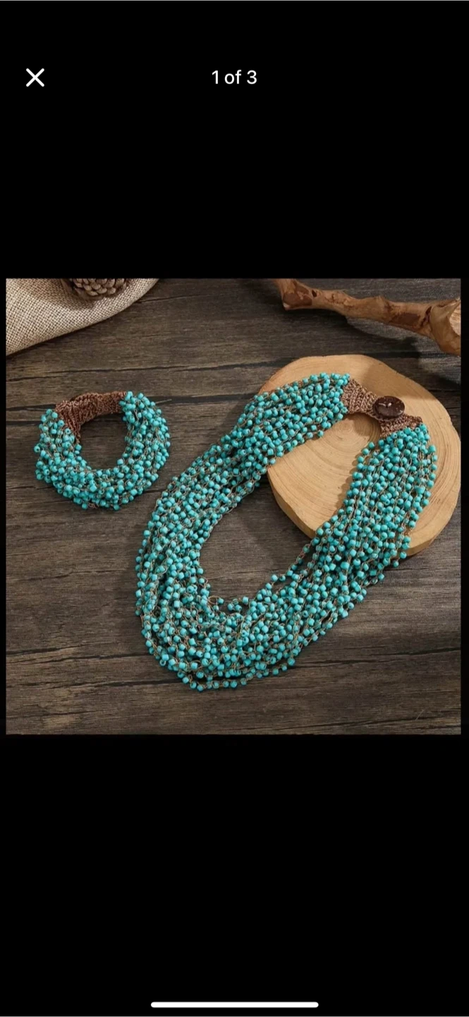 Here's a beautiful matching necklace and bracelet set! The beads are a lovely turquoise colour, perfect for adding a pop of colour to any outfit. The necklace has multiple strands of beads, and the bracelet is a single strand. Both pieces are in great condition and ready to be worn