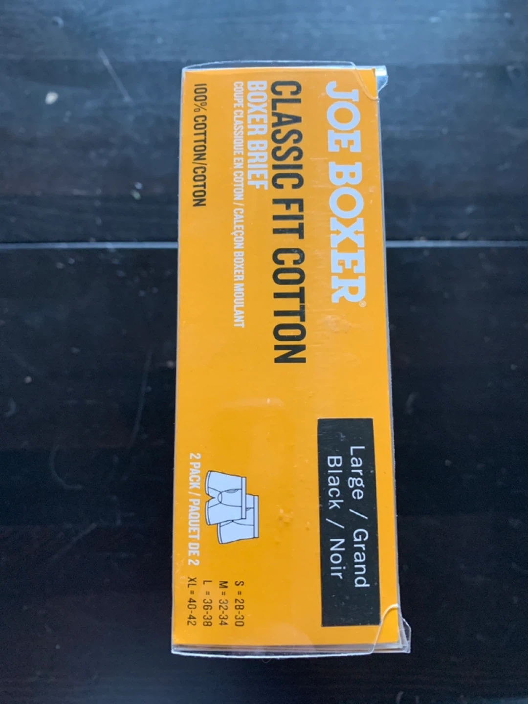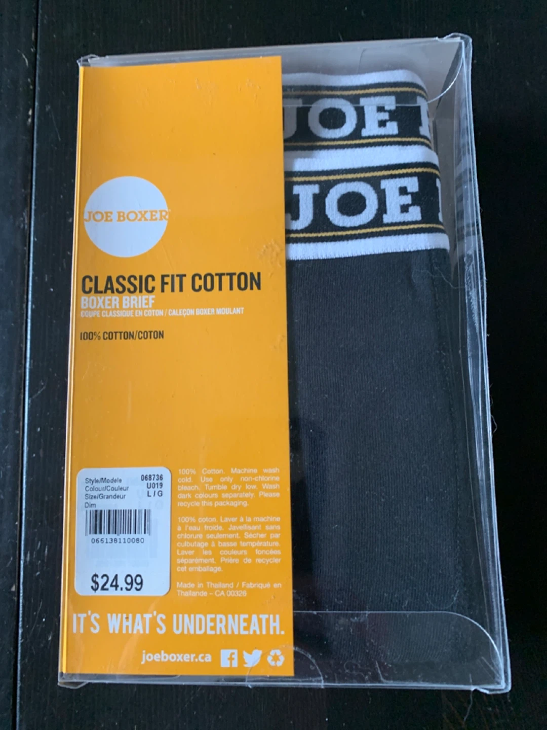Selling a brand new(obviously ;) in-box 2-pack of Joe Boxer Classic Fit Cotton Boxer Briefs in size Large and the colour Black. Originally bought for $24.99. They're made of 100% cotton, and the packaging says they're soft and supportive!
