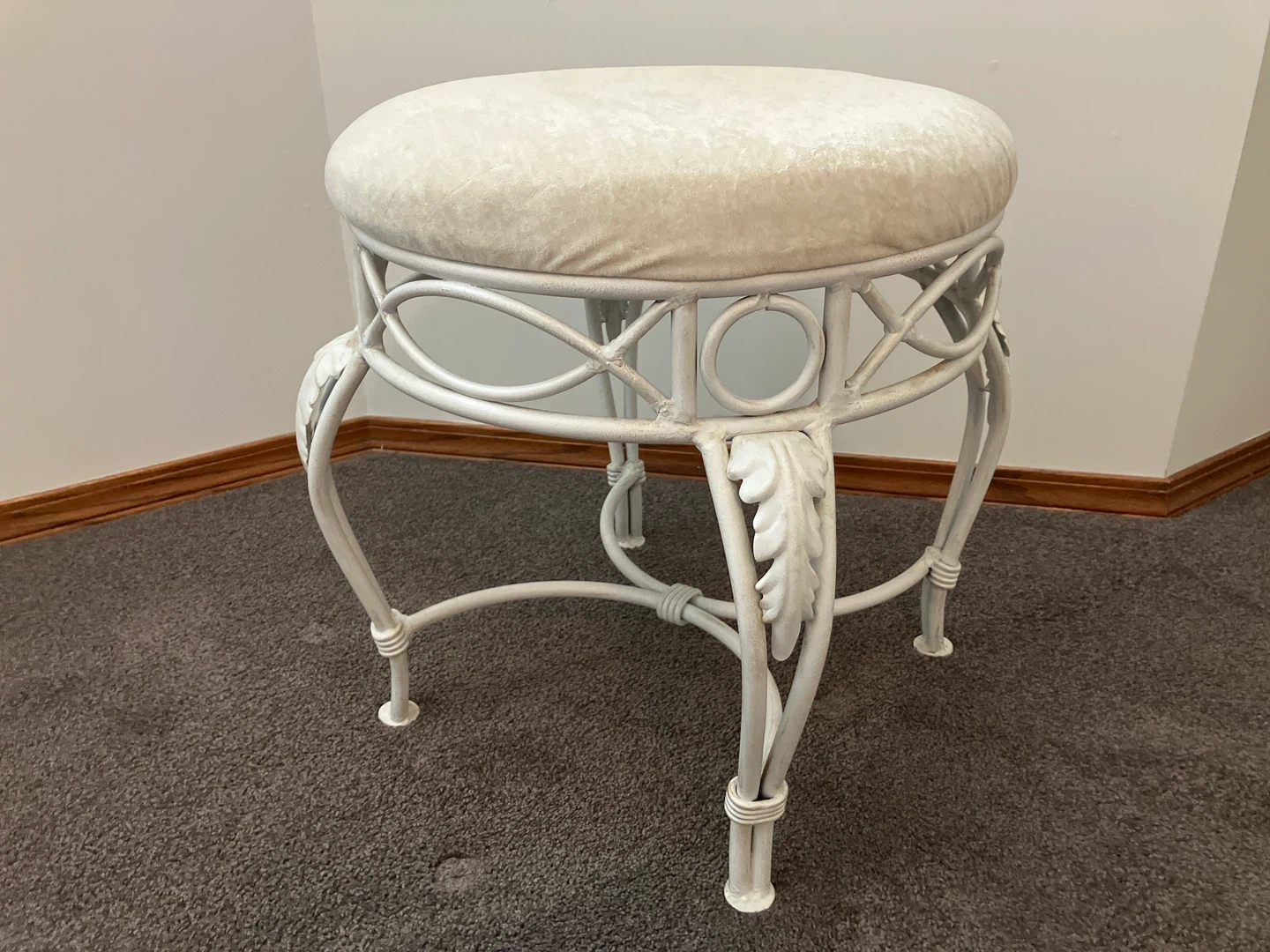 60Selling a cute white round bathroom stool! It has a soft velvet cushion on top, making it comfy to sit on. The frame has a decorative design with leaf accents. Mint condition
