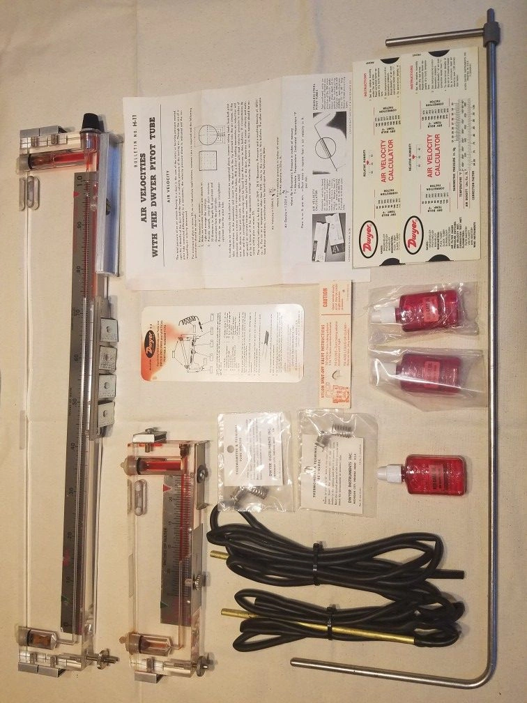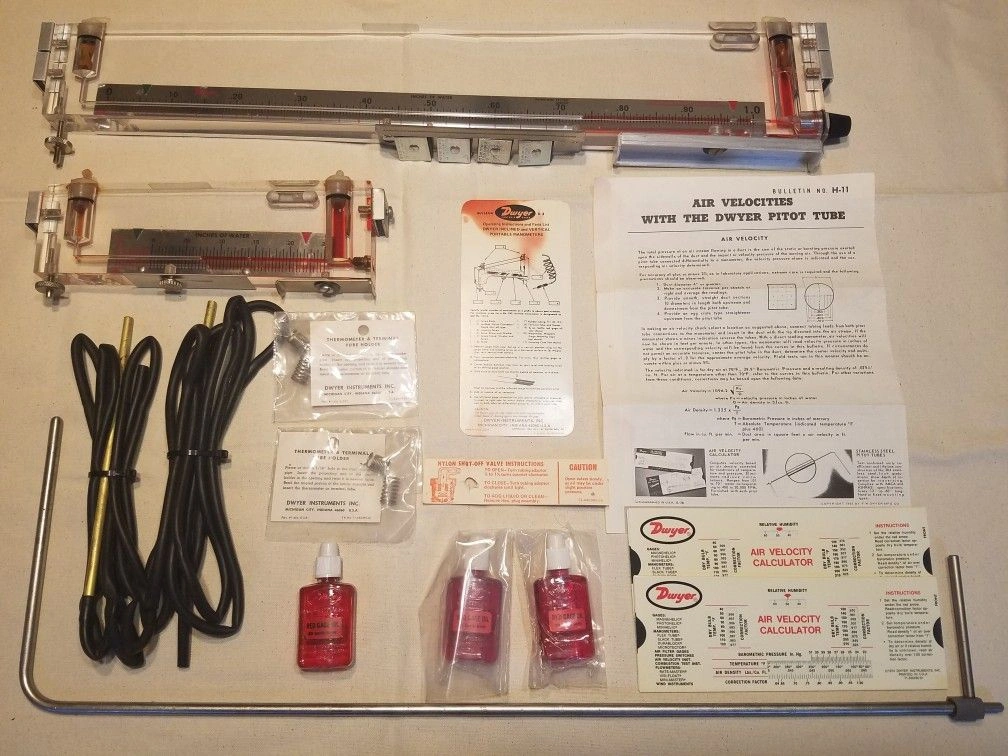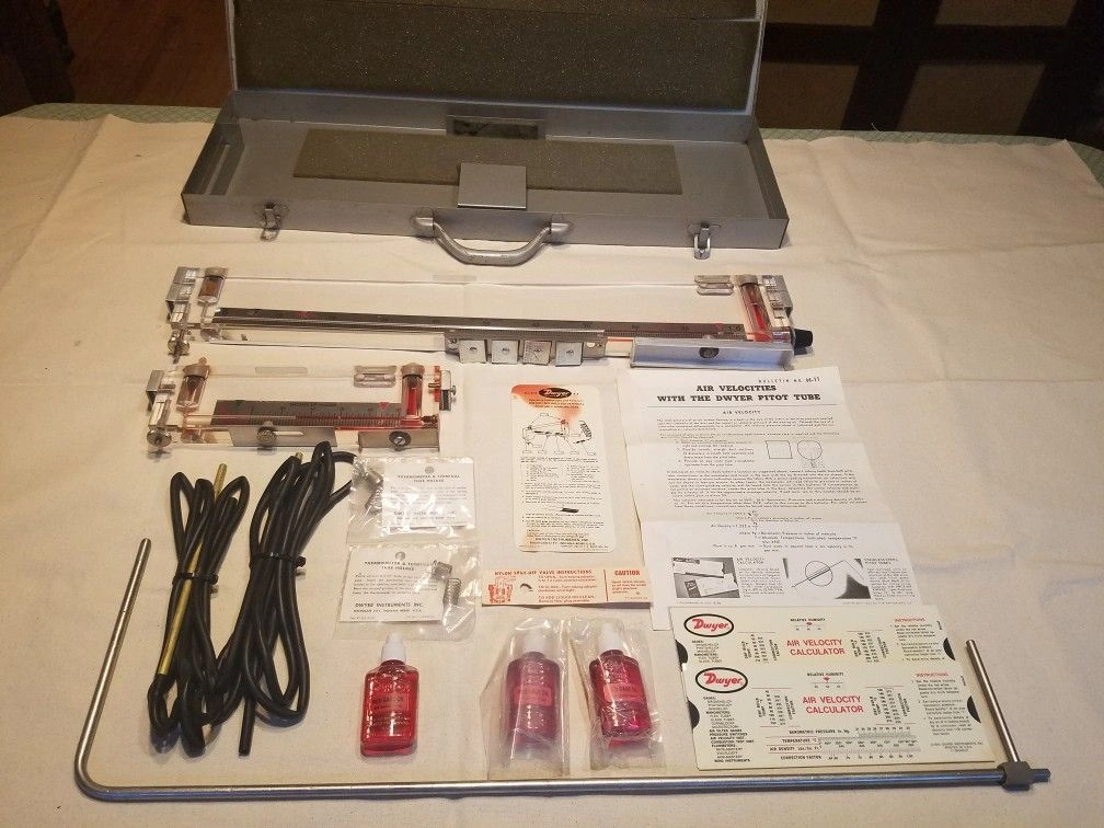 65This is a complete Dwyer Instruments 125 AV Air Velocity Manometer kit. It also has the 115 AV Gage included. It is used but looks barely used. It comes with extra supplies as seen and everything included. Accessories and parts are still available online at Dwyer instruments if needed in the future. This is quite a set in amazing condition.