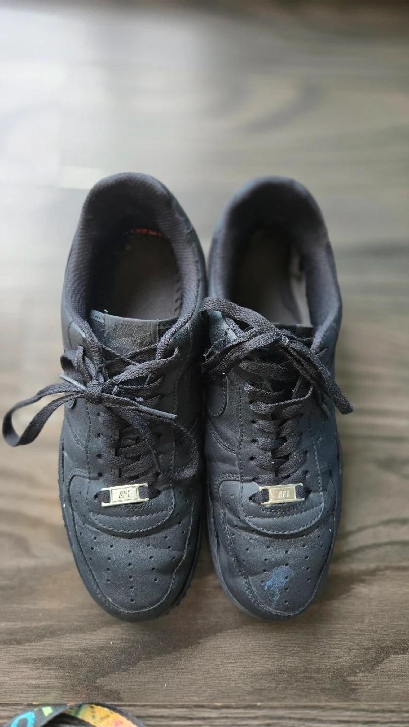 Selling a pair of black Nike Air Force 1 sneakers in US size 9. They're in good condition and ready for a new home! Please check out the photos for more details.