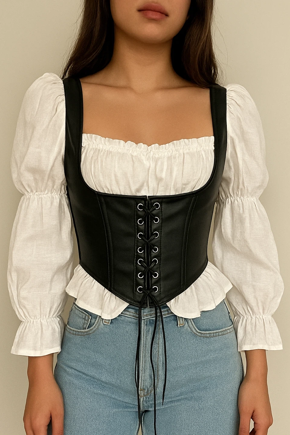 A stylish black and white corset top, perfect for adding a unique touch to your wardrobe! The design features a corset-style front with lace-up detailing and puffy sleeves. It's in great condition am b la lassand ready for a new home
