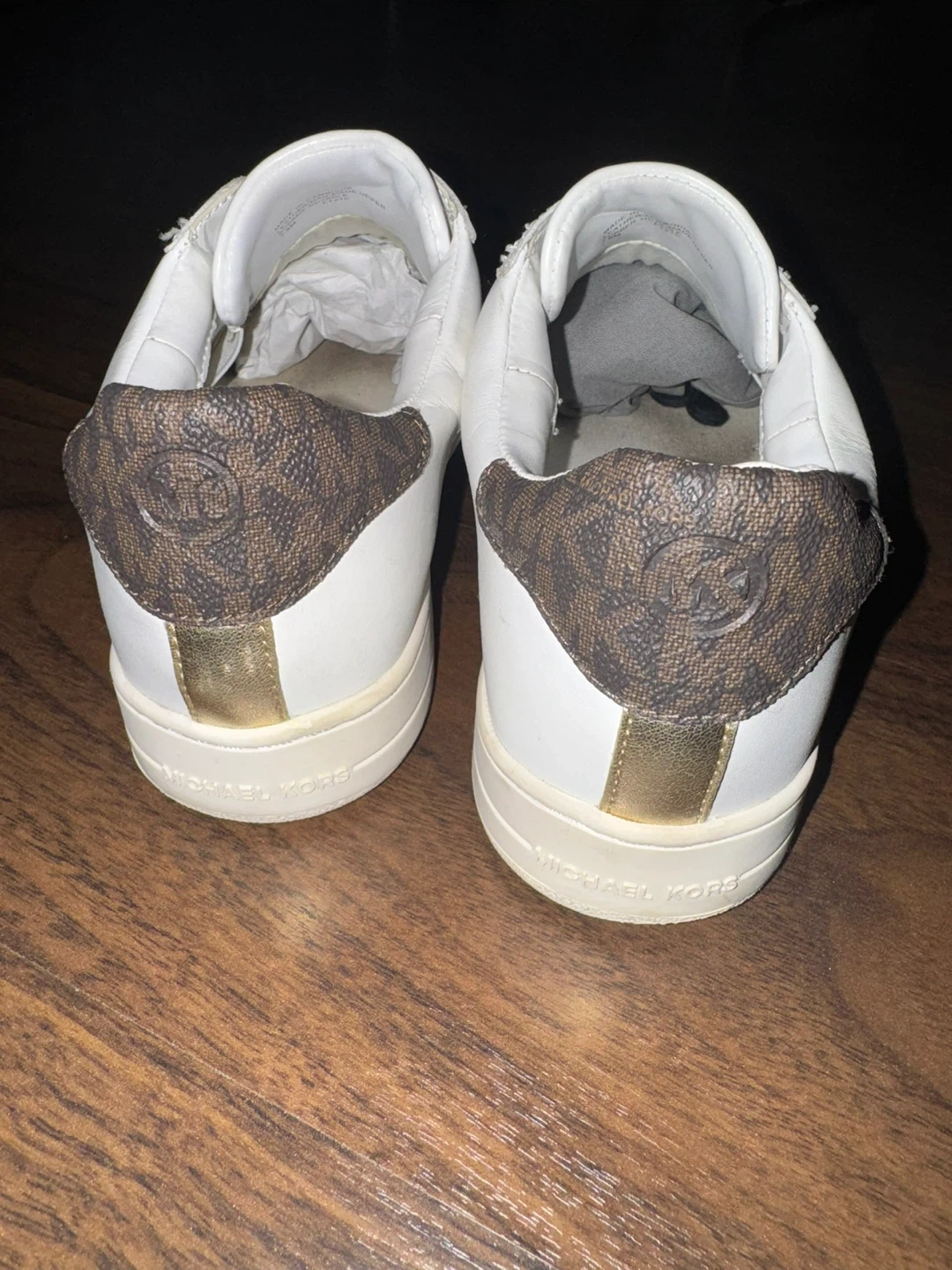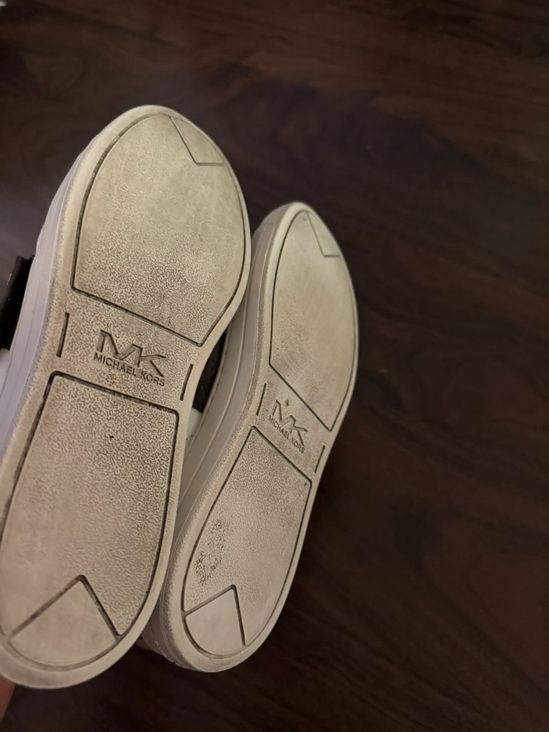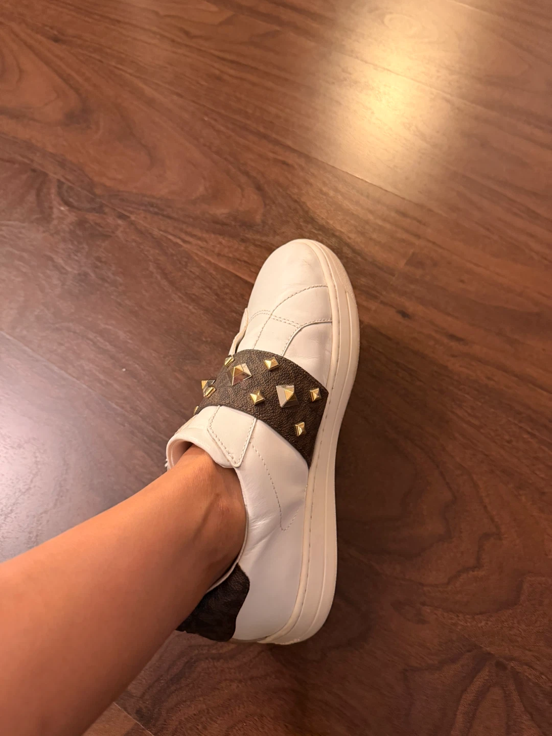 These are a pair of Michael Kors slip-on sneakers in white leather. They feature a brown logo print band with gold-tone pyramid studs. The shoes are in good condition