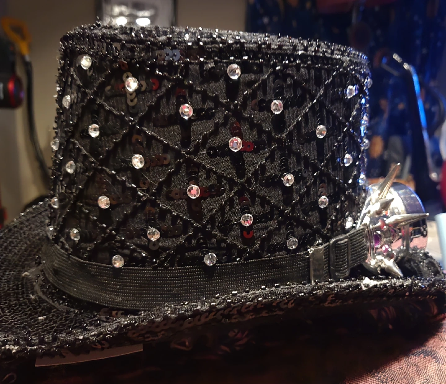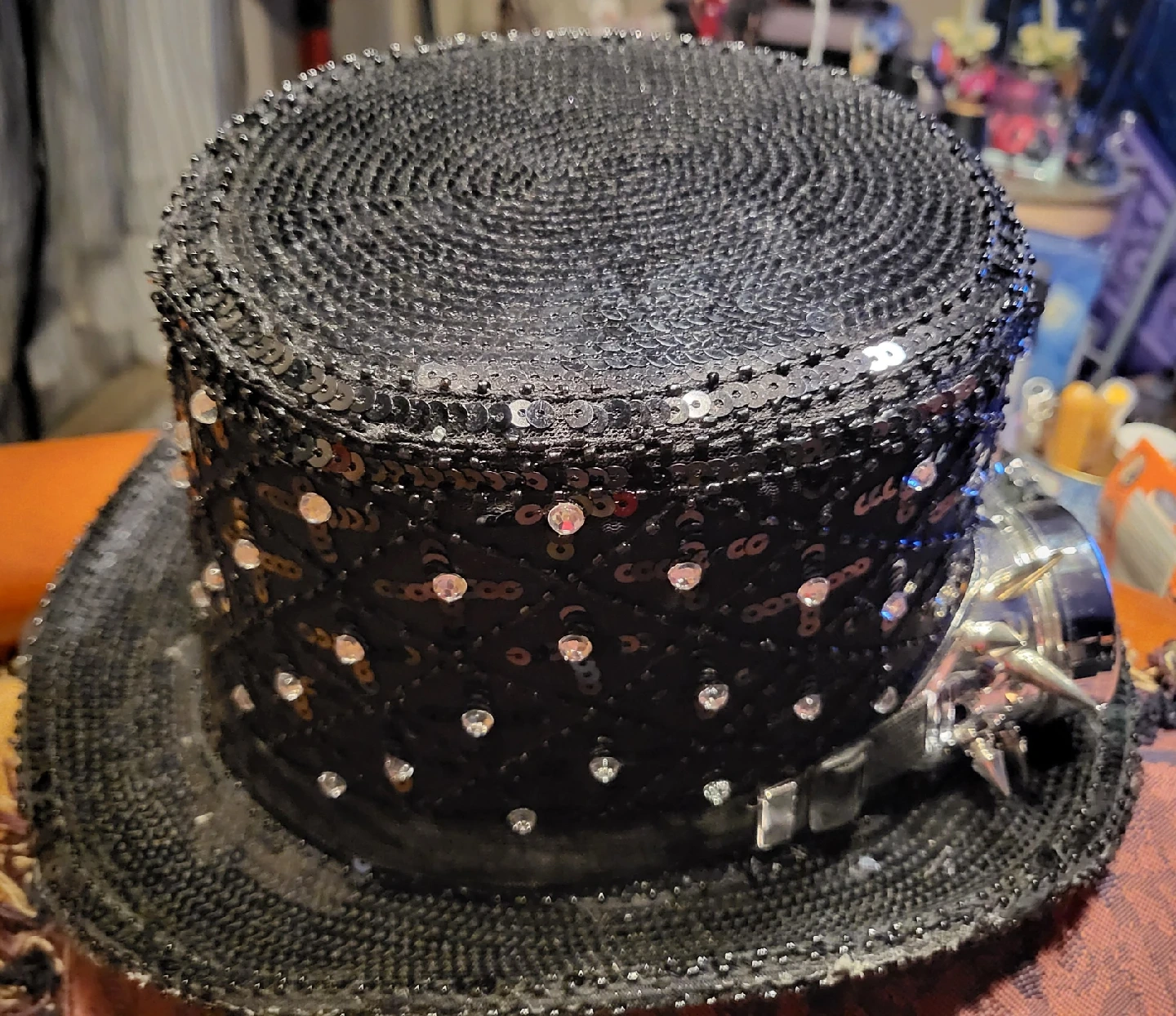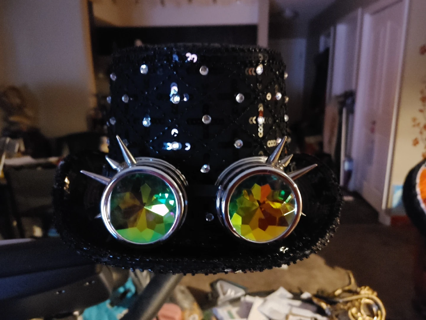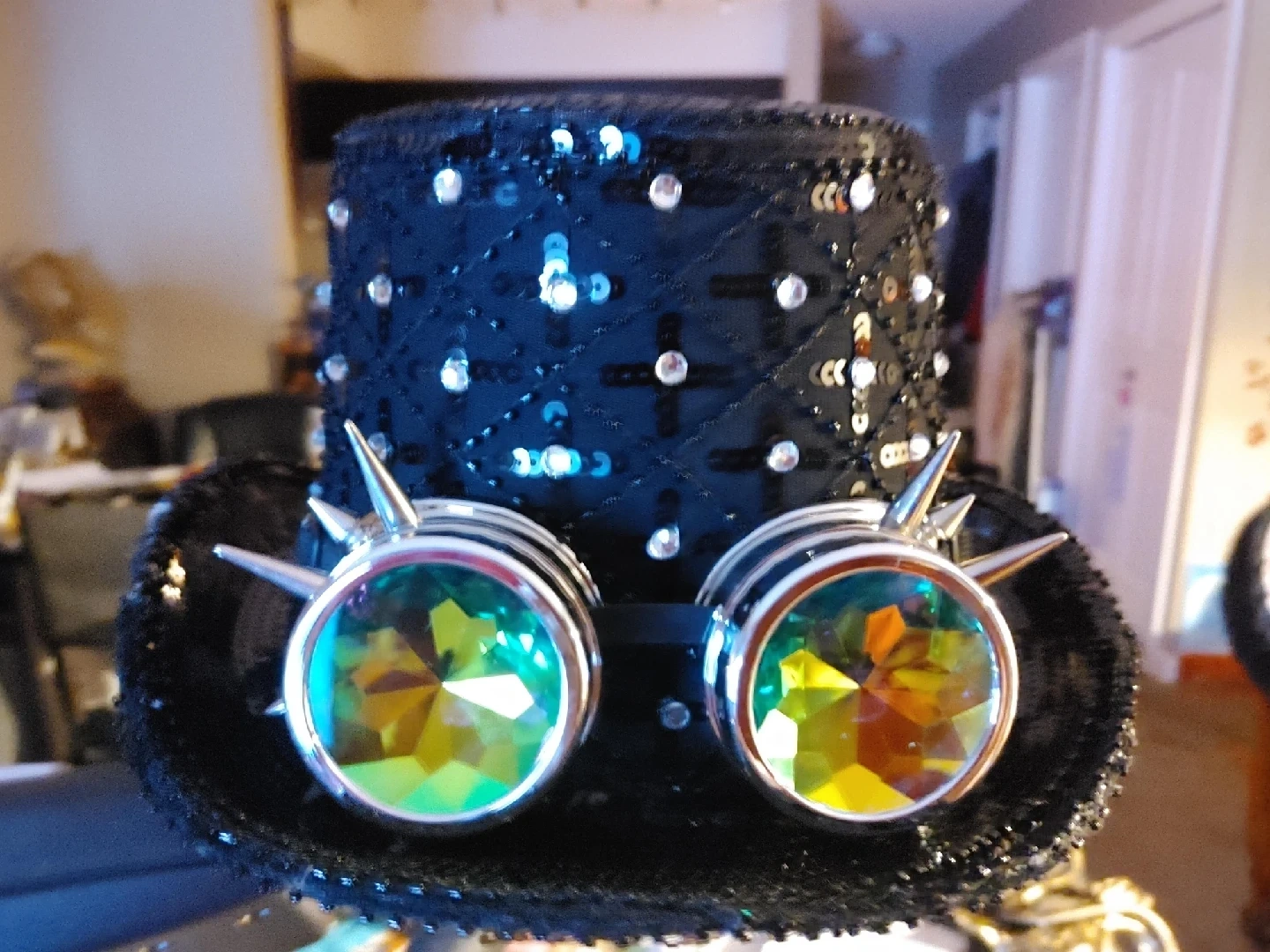 Here's a fun steampunk-style top hat with attached goggles! It's perfect for costumes, parties, or just adding a bit of flair to your outfit. The hat is black and covered in sequins, and the goggles have colourful lenses.
