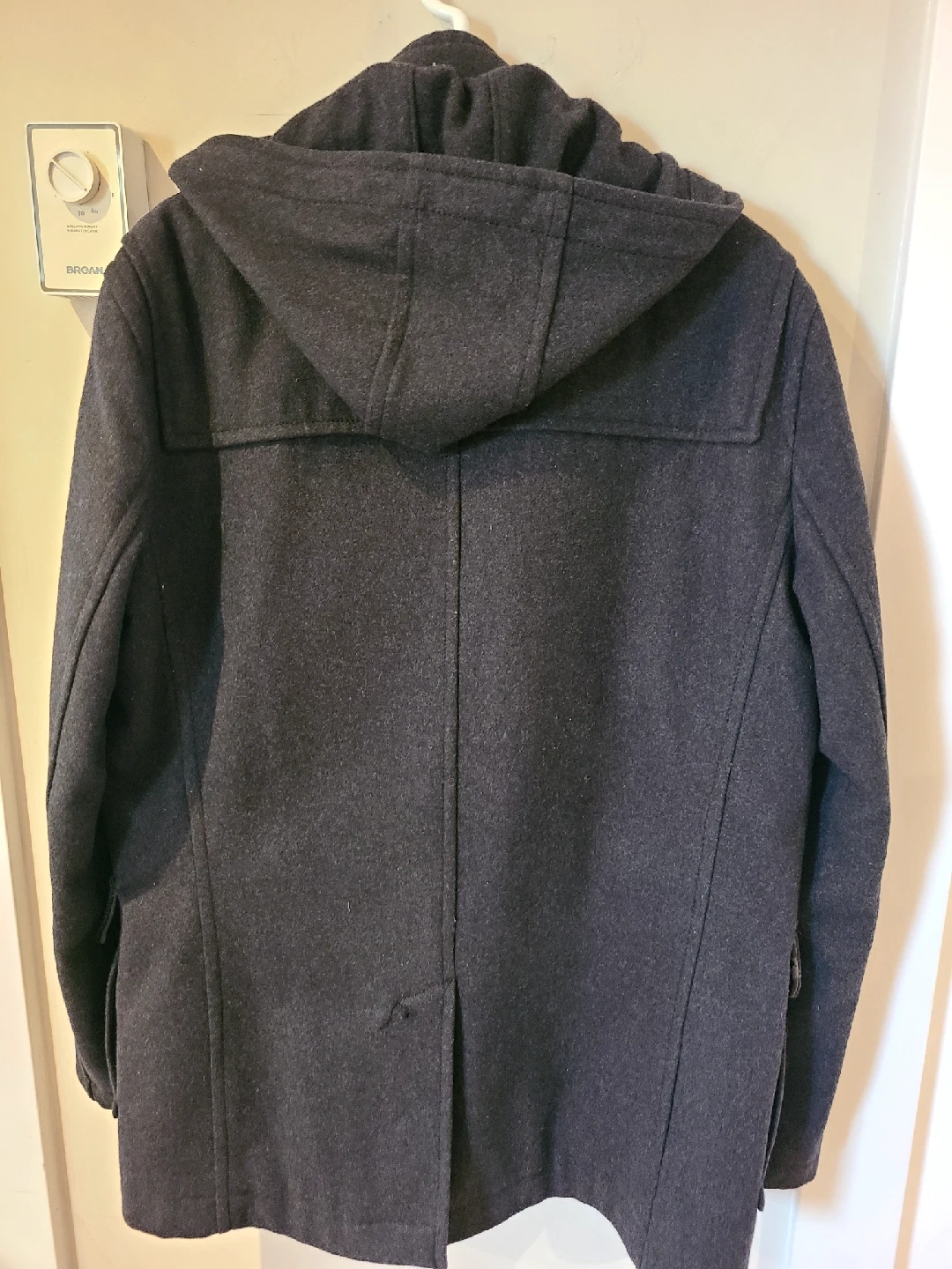 Here's a Zara Man duffle coat in size L. It's a stylish and warm coat, perfect for the colder weather. The coat features a hood and toggle closures. It’s in great condition!