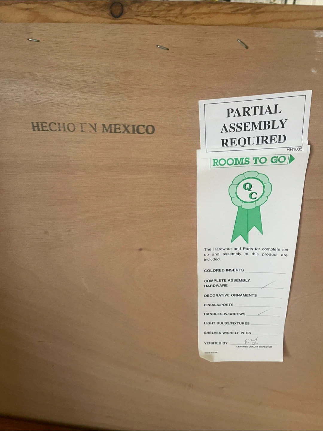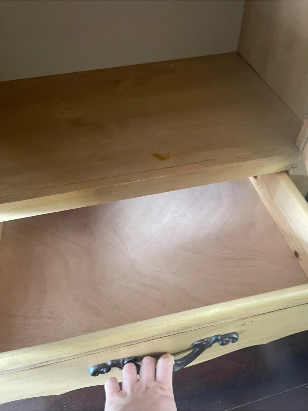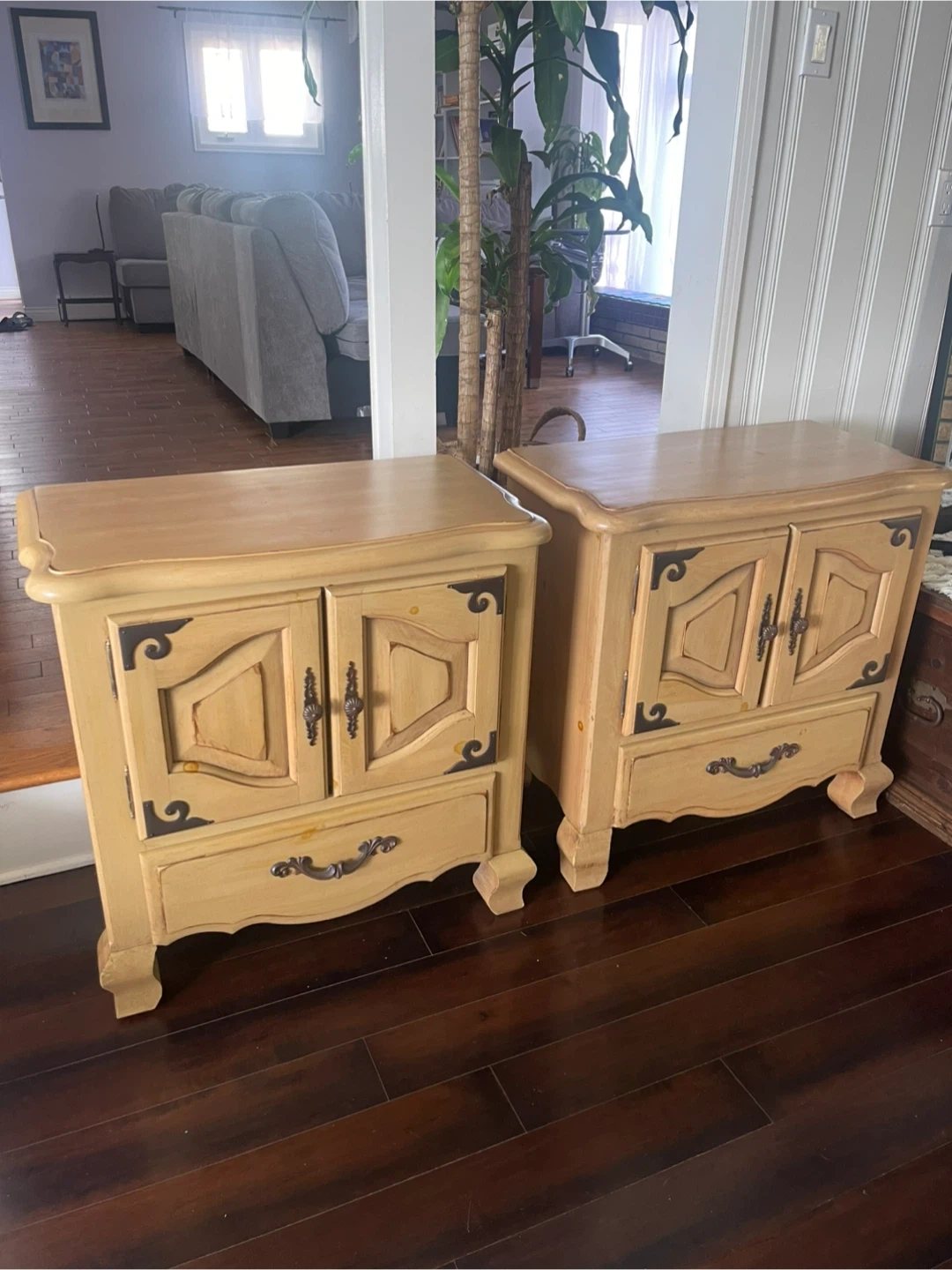 Selling a wooden nightstand with a drawer and cabinet. It has a unique design with decorative metal accents. Perfect for adding a touch of rustic charm to your bedroom!