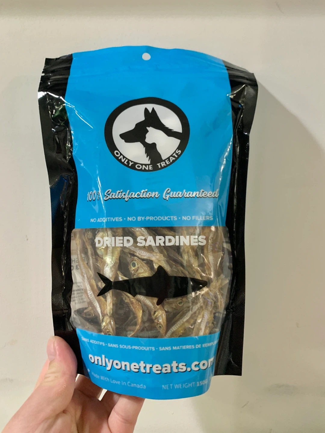 Selling a bag of Only One Treats Dried Sardines for dogs. They are 100% satisfaction guaranteed, with no additives, by-products, or fillers. Your pets deserve the best! Net weight is 150g / 5.3 oz