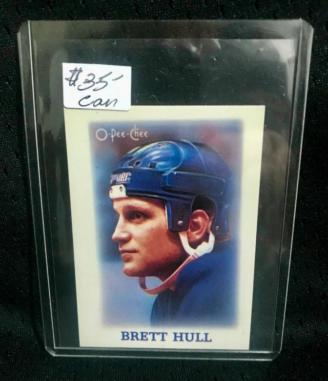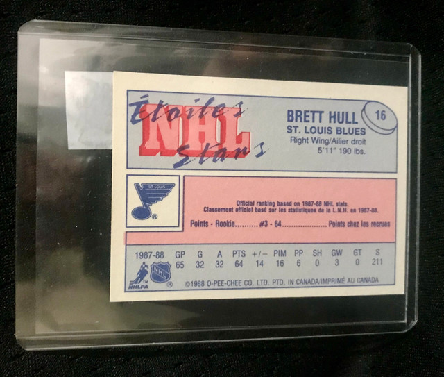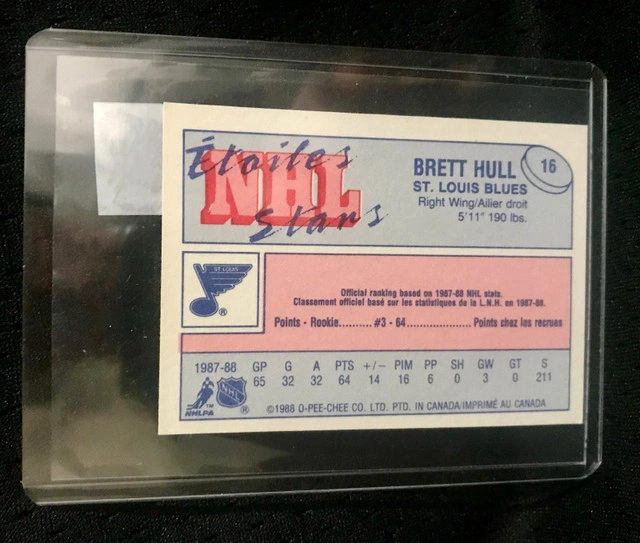 For sale is a Brett Hull 1987-1988 O-Pee-Chee All Star #35 NHL hockey card. This vintage card features a profile image of Brett Hull in his hockey gear on the front, with details from the 1987-88 season on the back. It is a collectible piece of sports memorabilia. The card is in great condition, considering its age. This card would make a superb addition to any vintage hockey card collection, especially for fans of Brett Hull or the St. Louis Blues. If the ad is still up, the card is still available. Just like a mischievous puck, it's waiting for a new home to slide into!