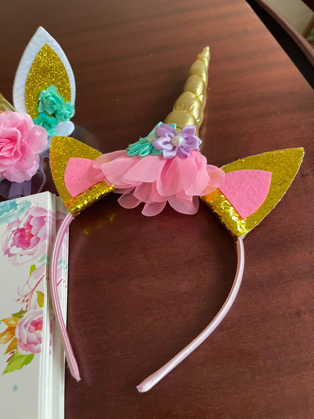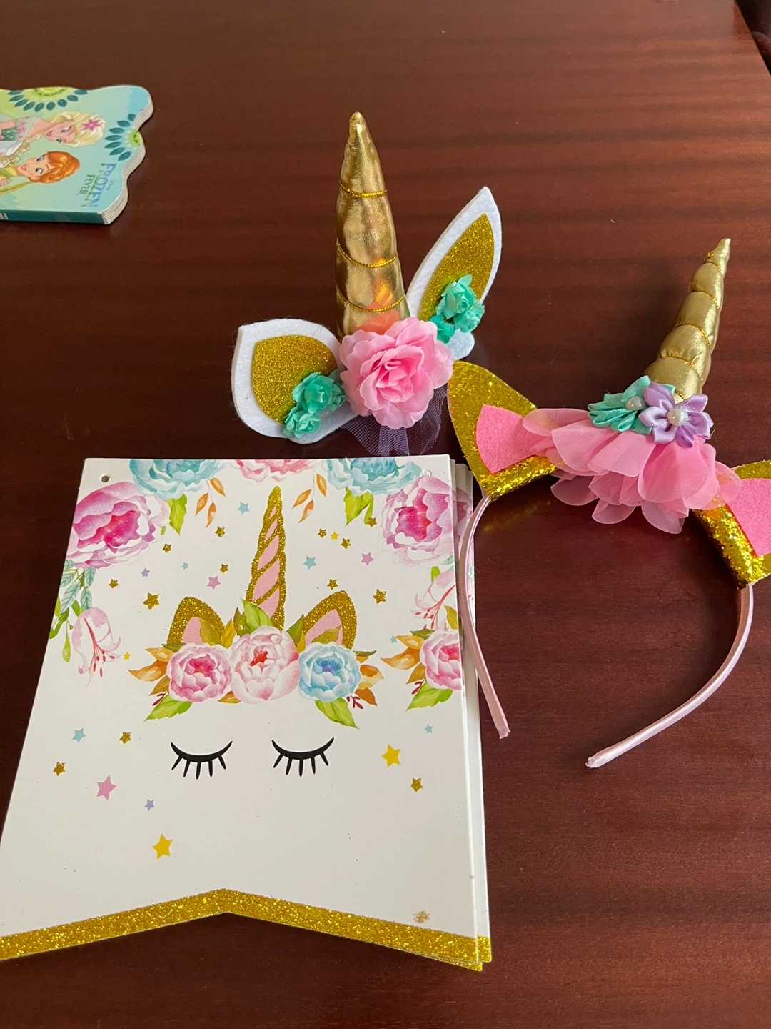 Selling a cute unicorn themed birthday banner , cake topper and a headband. Perfect for a unicorn themed party or birthday celebration