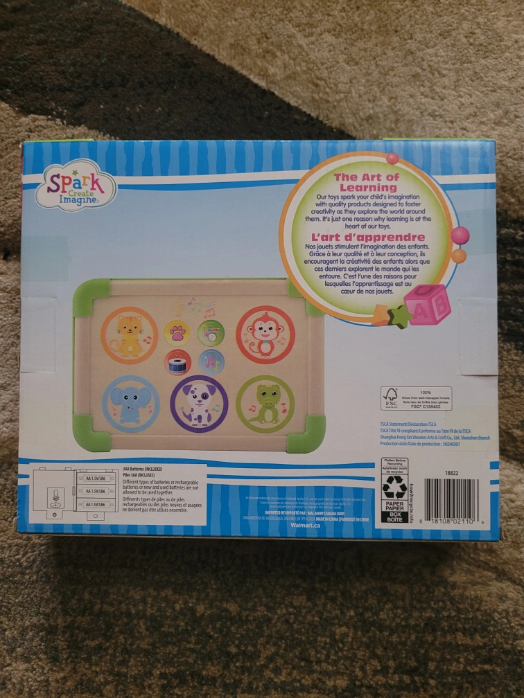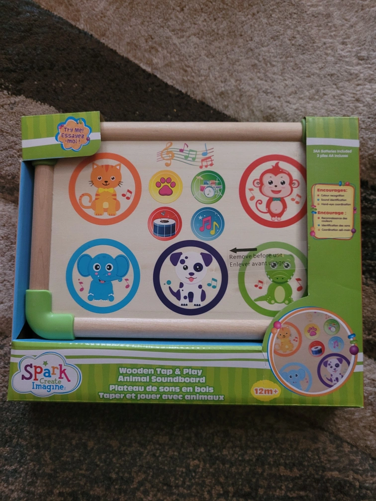 Selling a Spark Create Imagine Wooden Tap & Play Animal Soundboard, perfect for little ones aged 12 months and up! It's in great condition and comes with the original box. This fun toy encourages hand-eye coordination and stimulates auditory senses with various animal sounds and musical notes. Batteries are included, so it's ready to play right away!