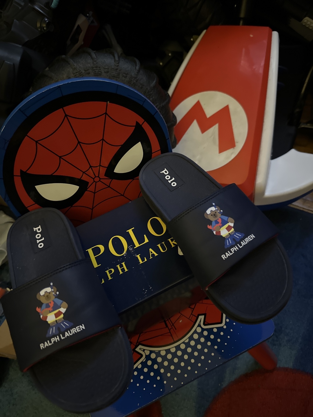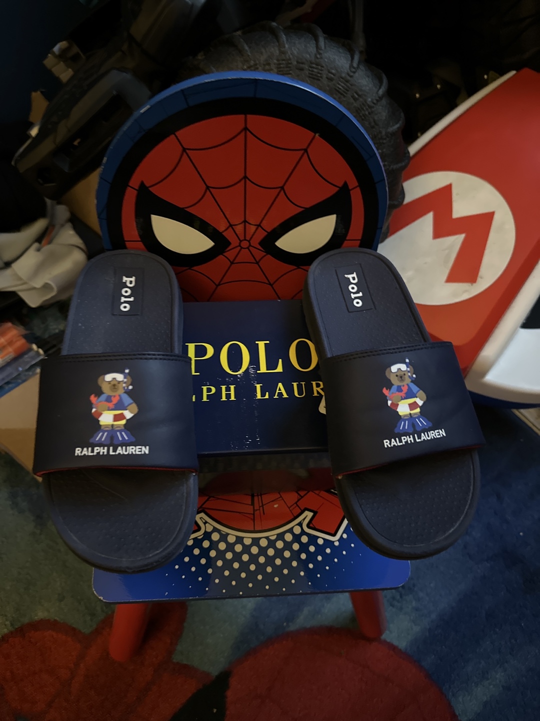These Polo Ralph Lauren slides are in great condition! They feature a navy blue color with the Polo logo and a cute bear design. Perfect for casual wear or a day at the pool. little kid size 1.5Y