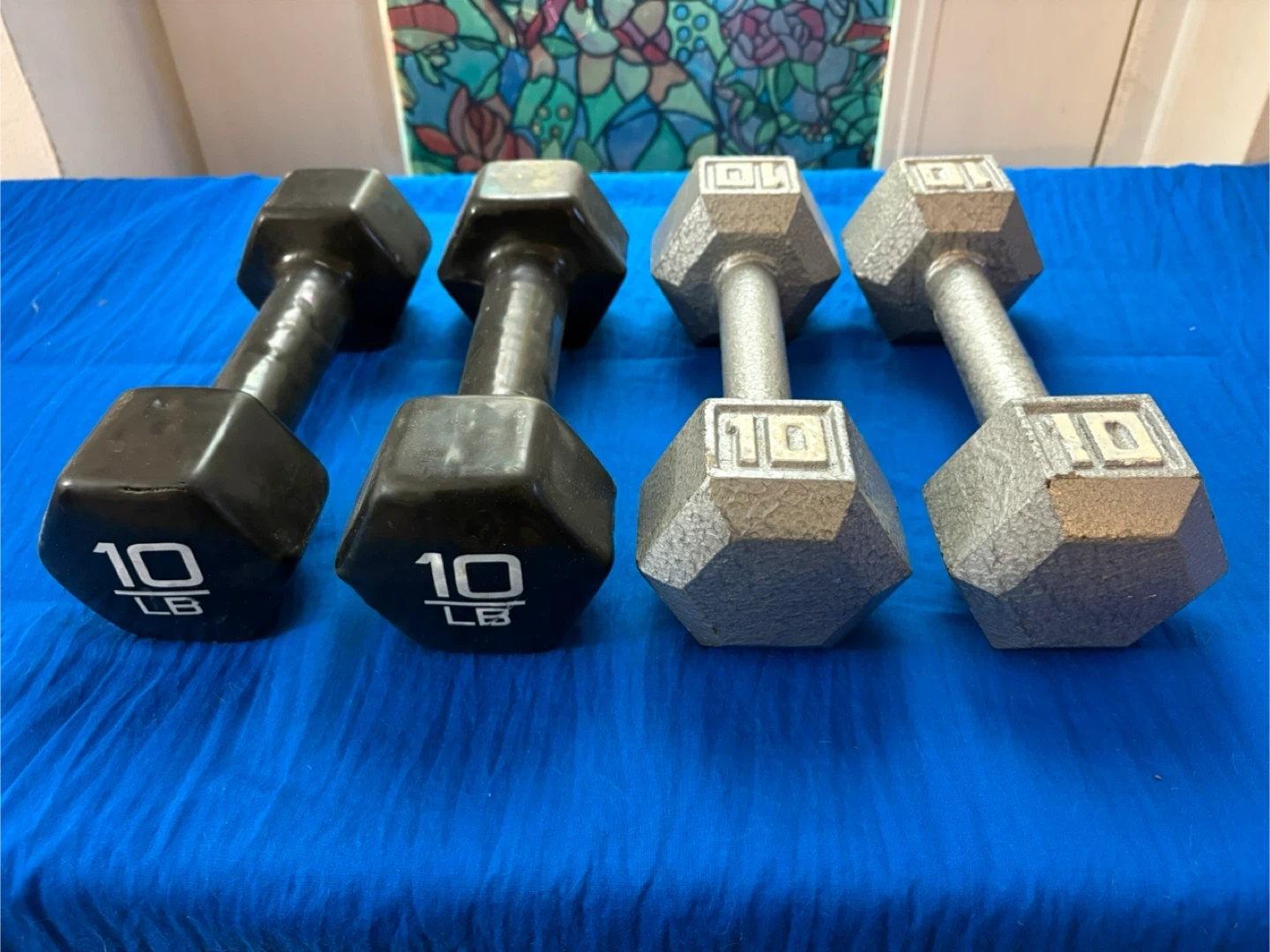 58Selling a set of four 10 LB dumbbells. Two are black and two are silver/grey. They are in good condition and ready for your home gym!