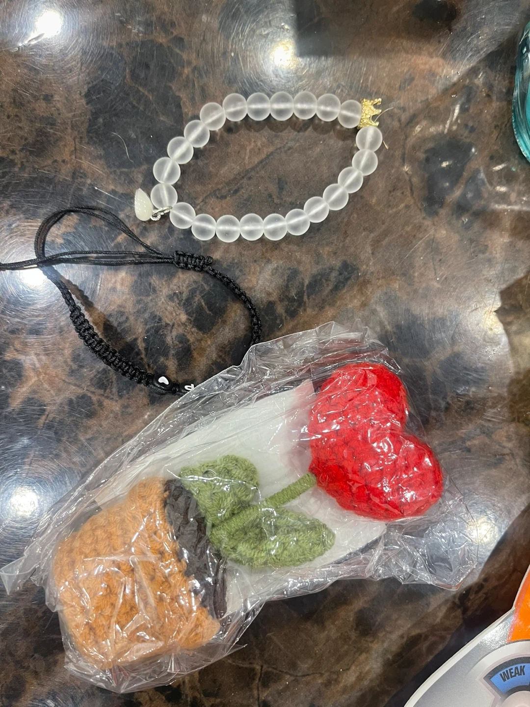 10Selling a handmade beaded bracelet, a crochet bracelet, and a cute crochet heart shaped flower still in its original packaging! The bracelets feature clear beads and a small charm. The crochet plant is a sweet little decorative piece. You can buy each for $8. I can sell them separately to you