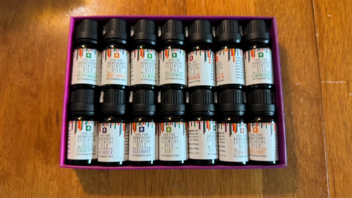 This set includes 14 bottles of 100% pure aromatherapy essential oils. Each bottle is 10ml and is Pro-Therapeutic Grade. Great for diffusers or personal use! Most of them haven’t been used - a few of them are half full or more.