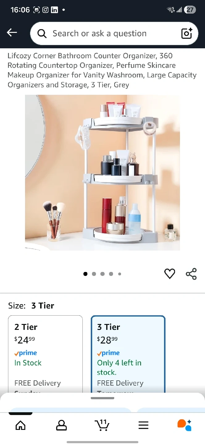 Selling a Lifcozy corner bathroom counter organizer with 3 tiers! It's a rotating countertop organizer, perfect for perfume, skincare, makeup, and vanity storage. It's designed to fit in a corner space and comes with 4 extra hooks. It can hold 27+ bottles and has metal brackets for support