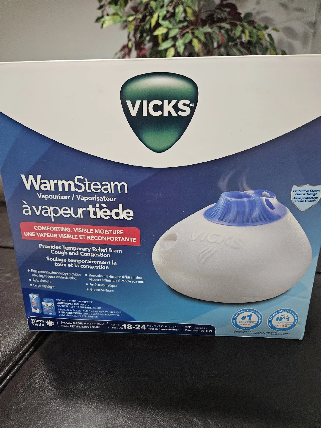I'm selling a Vicks WarmSteam Vaporizer. It provides temporary relief from cough and congestion. It has dual scent pad technology that provides soothing vapours while you're sleeping. It also features an auto shut-off and a large highlight. The vaporizer has an 18-24 hours of operation and a 3.7L capacity.
