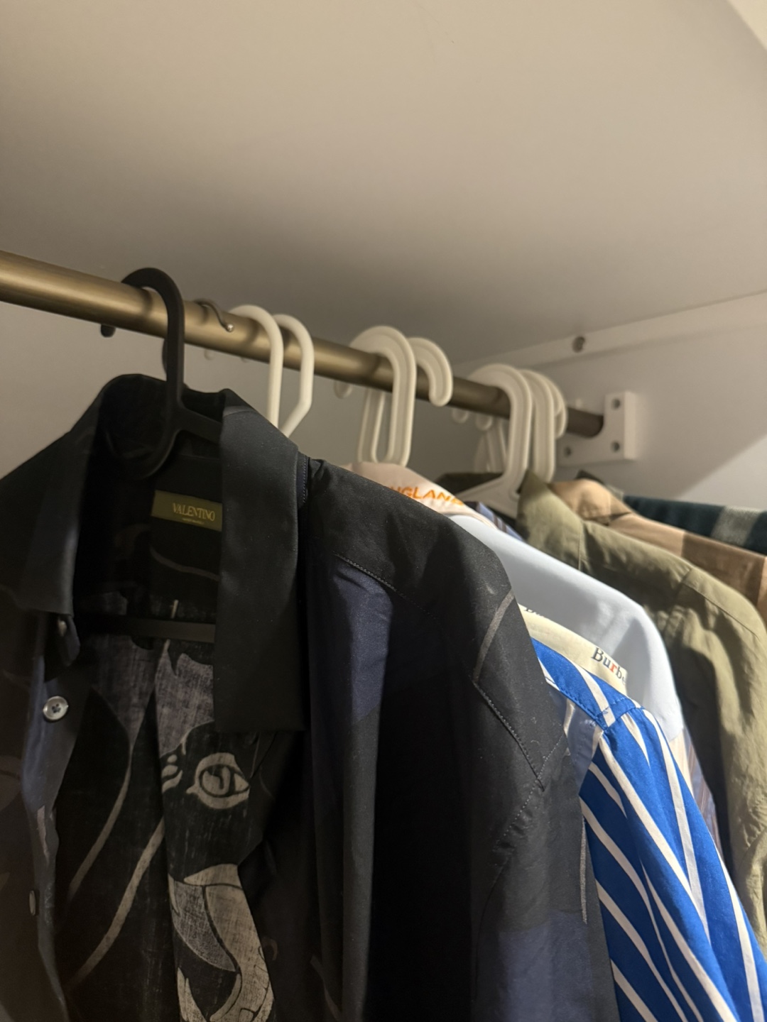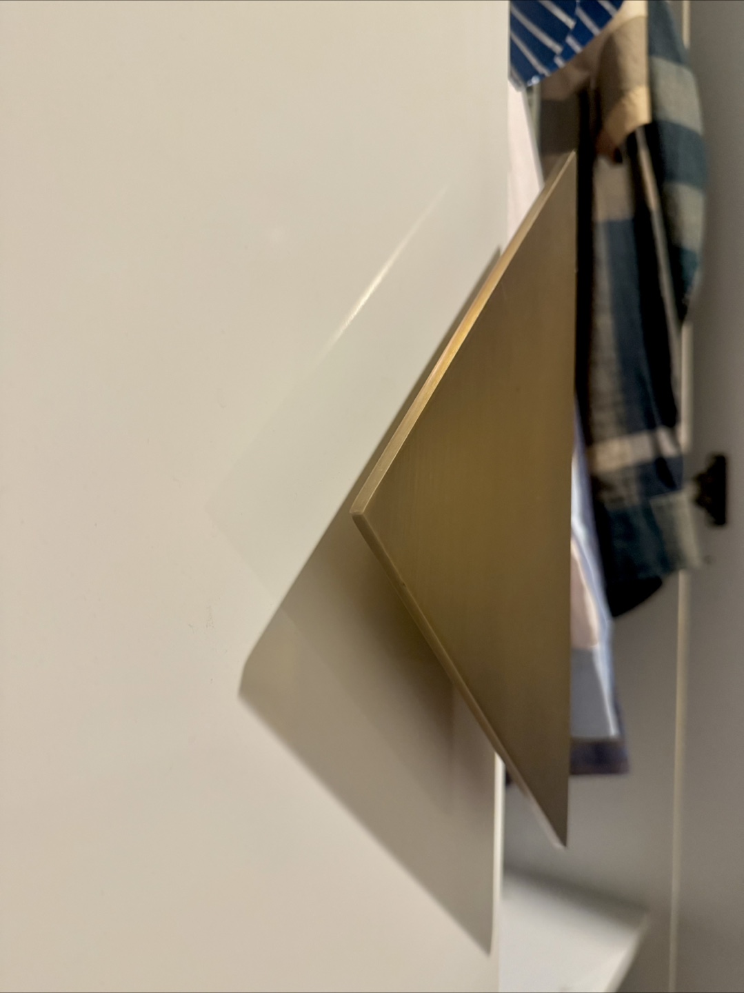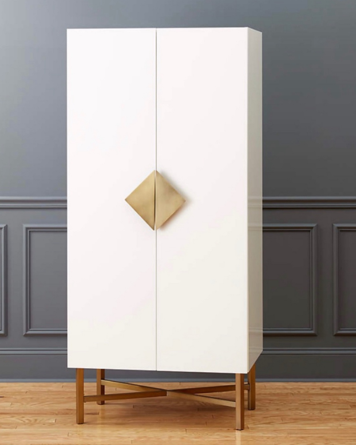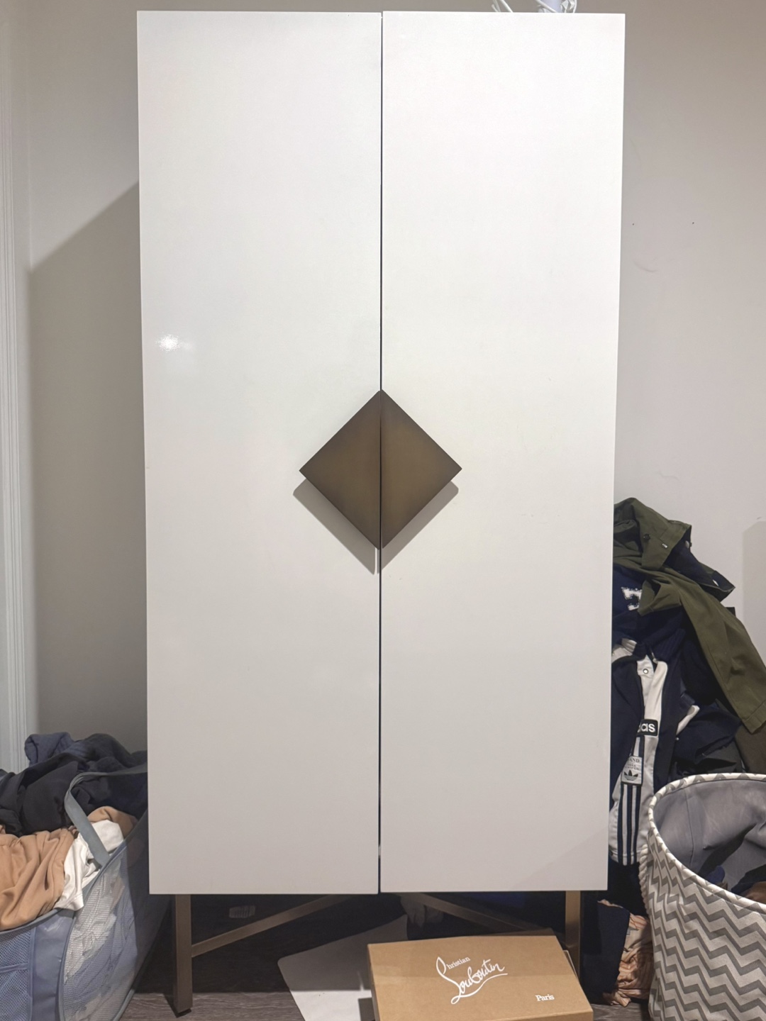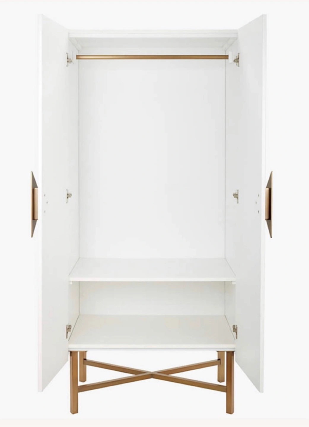 CB2 Astoria armoire. White with a lacquer finish design with brass pull and legs. one fixed shelf and removable brass pole for hanging clothes. Width: 34 inches, Height: 74 inches, Depth: 24 inches. Pick up from queens Elmhurst