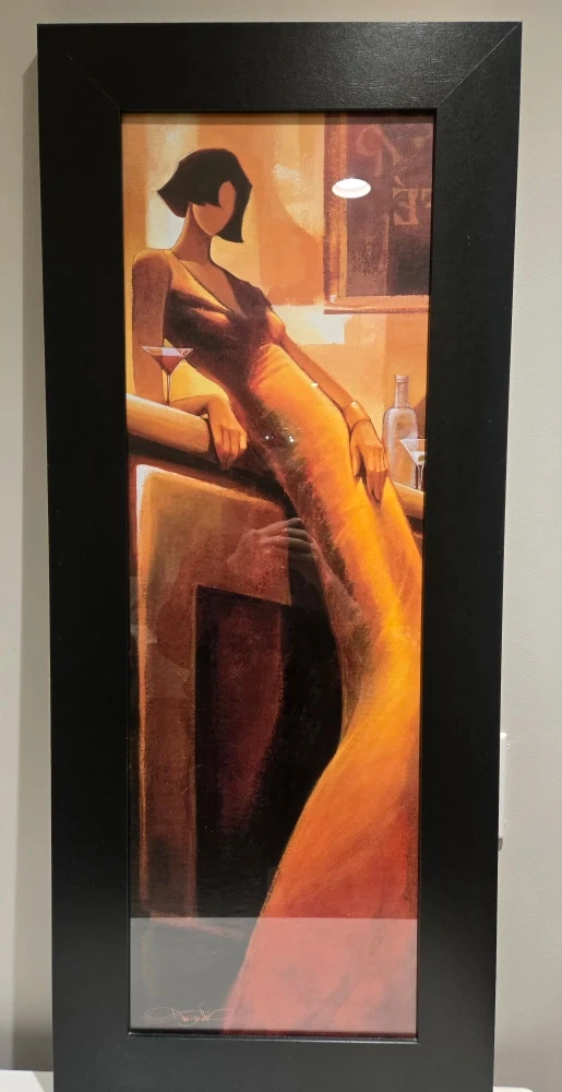 Selling a framed art print featuring a woman at a bar. The frame is black and the print is in warm tones. It measures approximately 41 inches tall and 17.5 inches wide