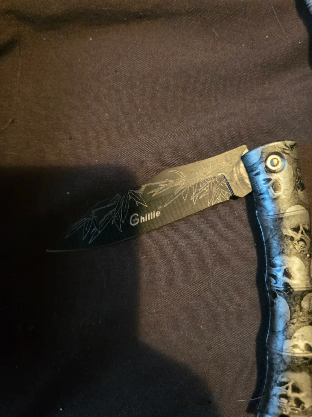 Here's a pocket knife with a unique skull design on the handle! It features a blade etched with bamboo and the 'Chilllie' logo. Perfect for collectors or everyday use