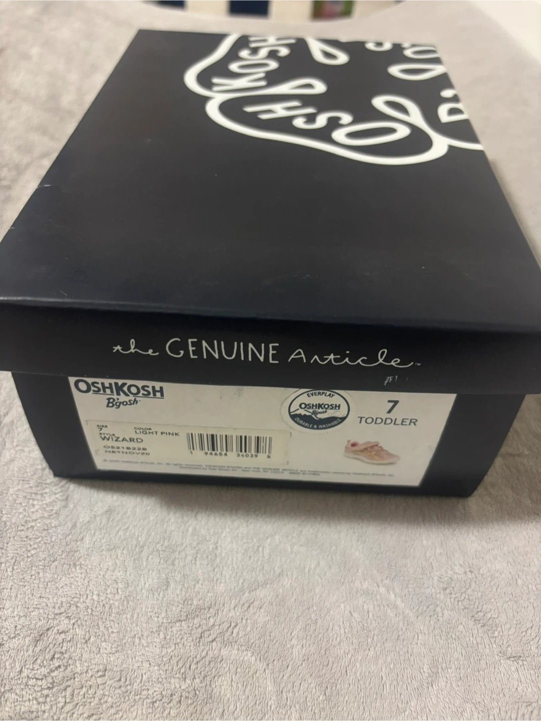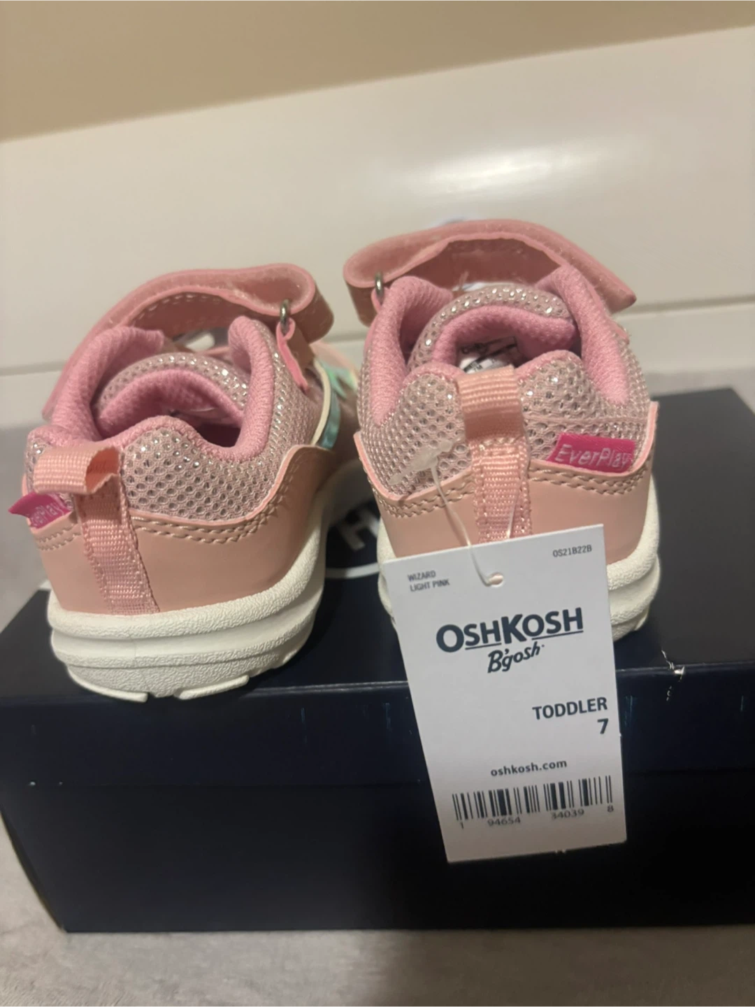 These OshKosh B'gosh toddler shoes are brand new in the box! They're light pink, with a bit of sparkle for your princess in size 7. These shoes are durable and washable, perfect for your little one!