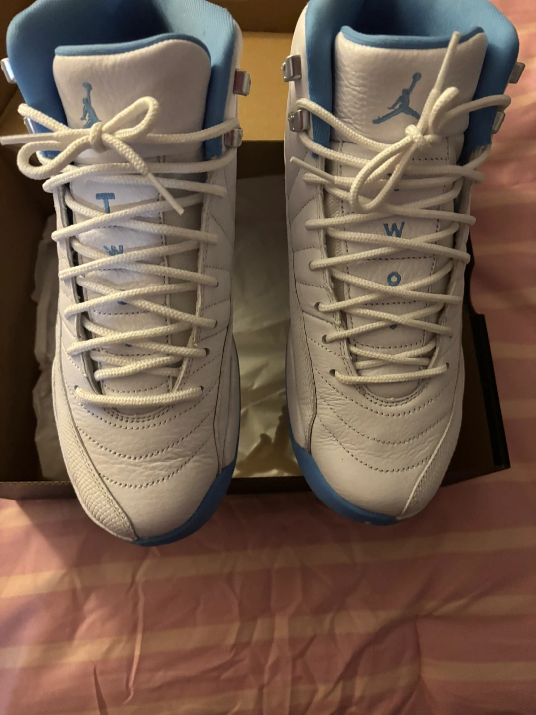 Selling a pair of Air Jordan 12 Retro UNC sneakers in white and university blue. They are in great condition and come with the original box. These are a classic and stylish pair of shoes!