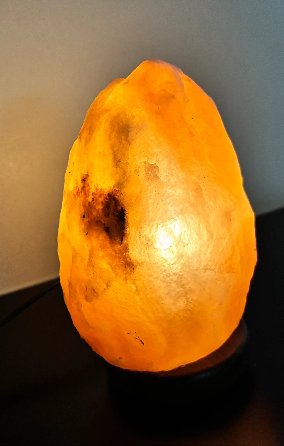 I'm selling a beautiful Himalayan salt lamp! It comes with a wooden base and cord with an on/off switch. When lit, it gives off a warm, ambient glow. Perfect for creating a relaxing atmosphere in any room