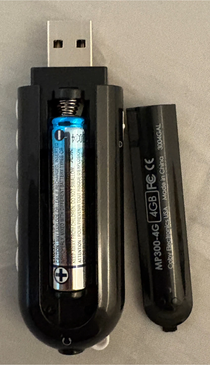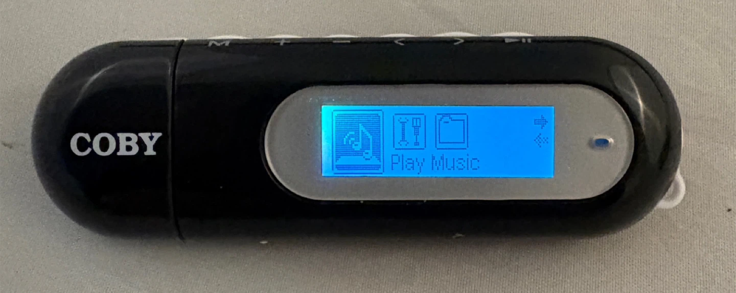 Selling a Coby MP300-4G digital music player. It is black and has a 4GB capacity. It uses a single AAA battery. Pick up is in Burlington.