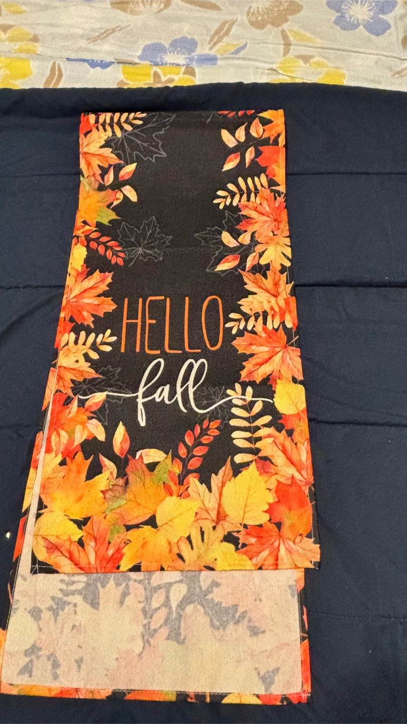 Add a touch of autumn to your dining table with this lovely 'Hello Fall' table runner! The design features vibrant fall leaves in shades of orange, yellow, and red against a black background. Perfect for Thanksgiving or any fall gathering!