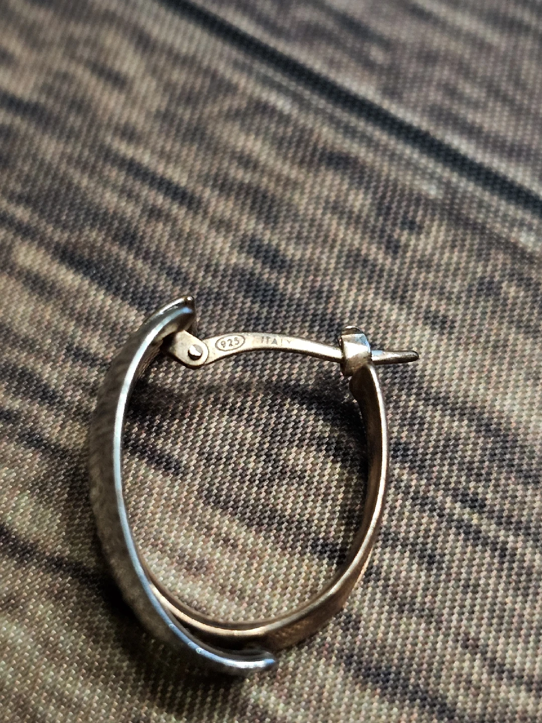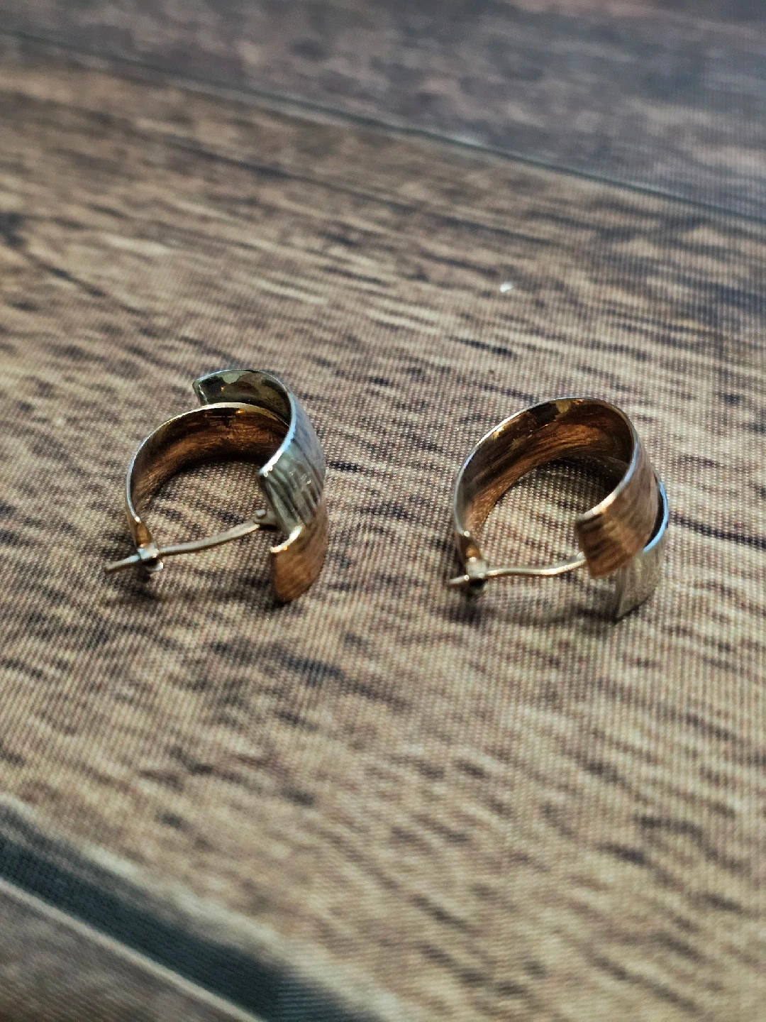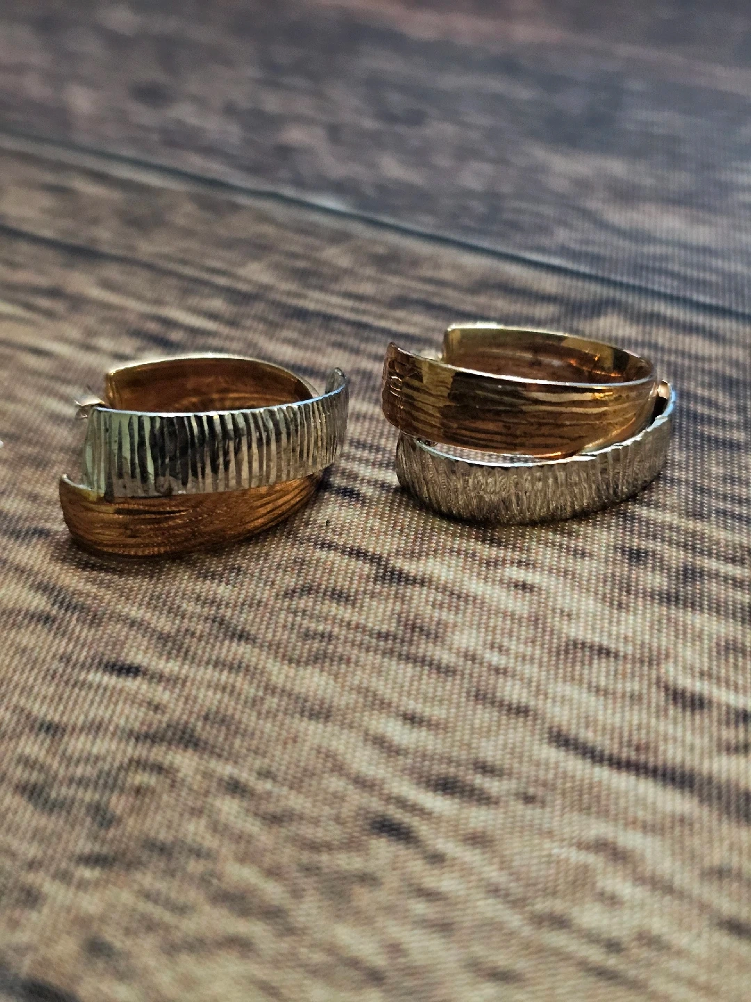 Selling a pair of two-tone hoop earrings. They feature gold and silver colours in a textured design. The earrings are in great condition and ready for a new home! Stamped 925 Italy
