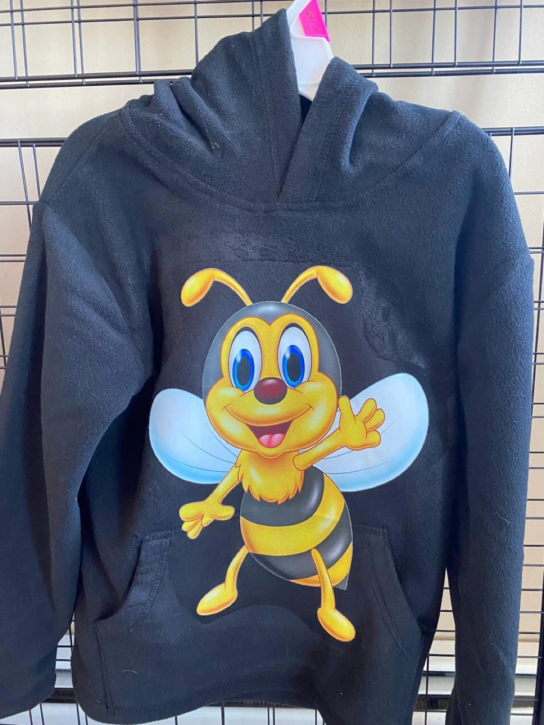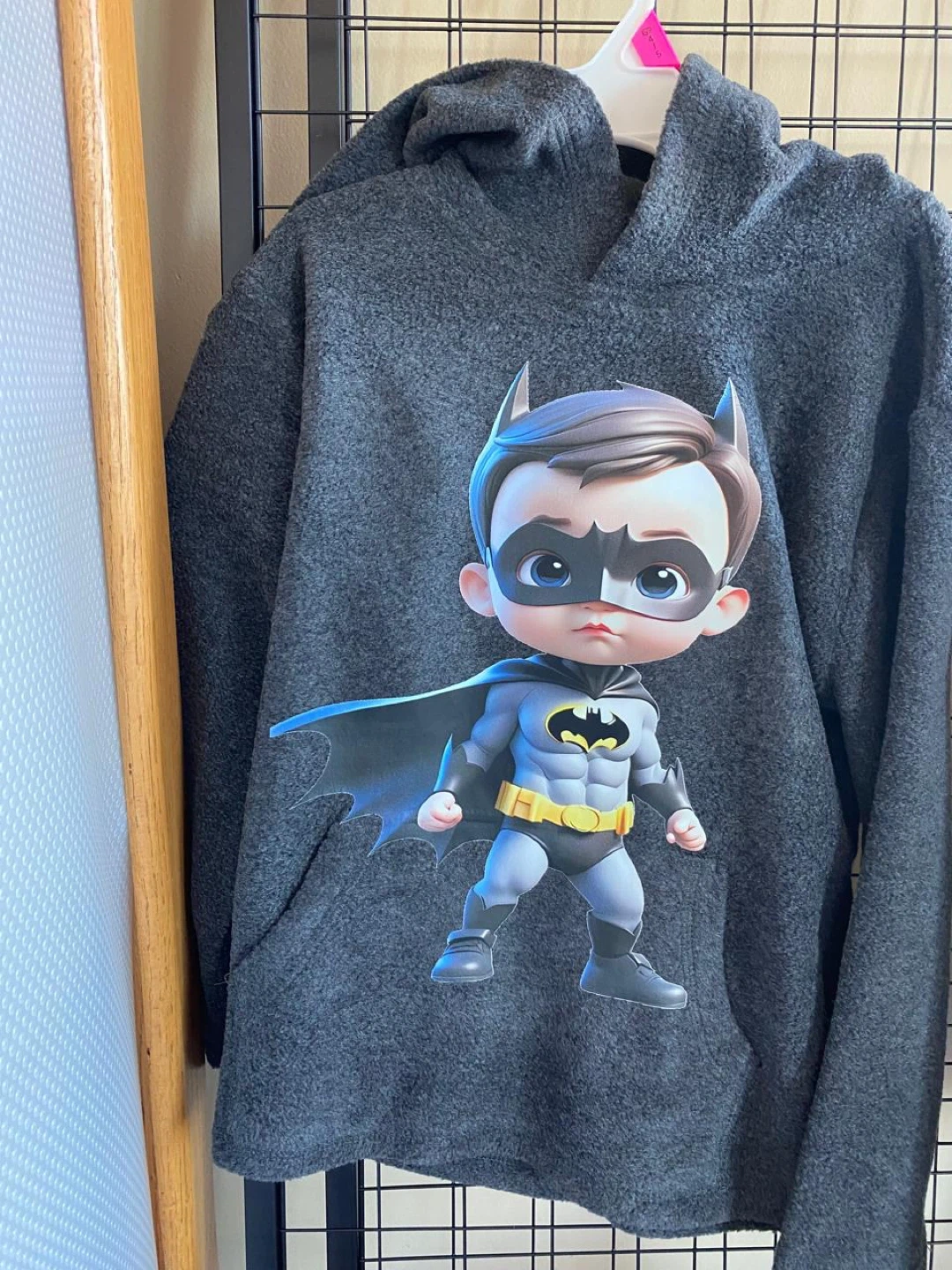 A selection of fun character hoodies and t-shirts for kids! Great for everyday wear or as a gift. The hoodies feature popular characters like Mickey Mouse, Batman, and a cute bee. There's also a t-shirt with a superhero design.
